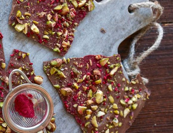 2. Bred ut chokladen ganska tunt på en plåt med bakplåtspapper. Strö över pistagenötter och frystorkade hallon.