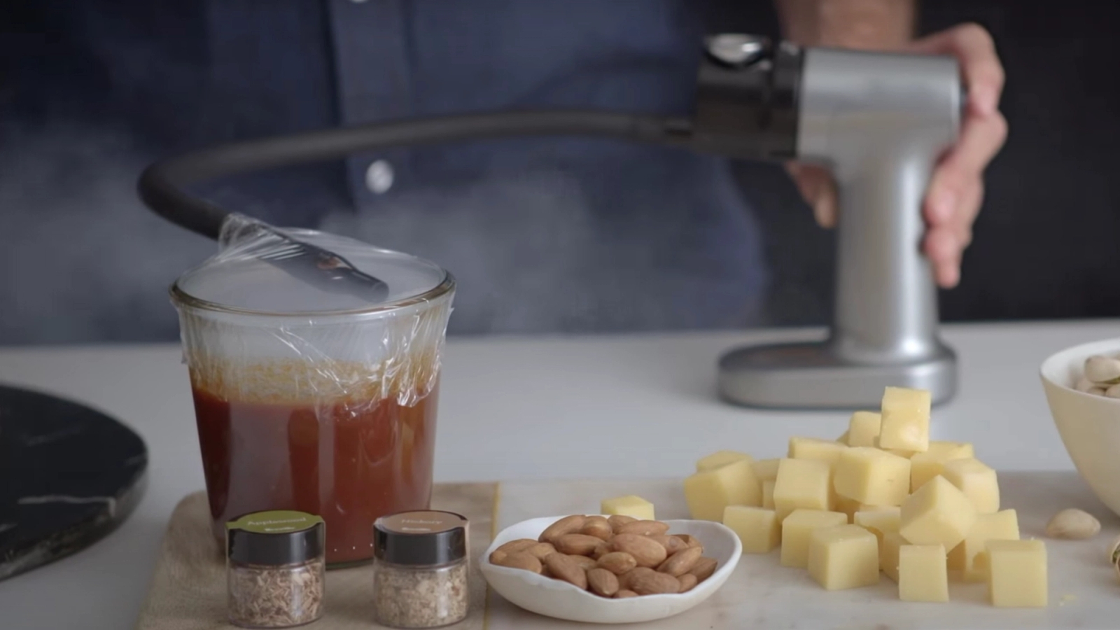 Att röka din måltid med rökpistol tar endast några minuter. Fyll behållaren med rökspån, tänd på och rök din mat.