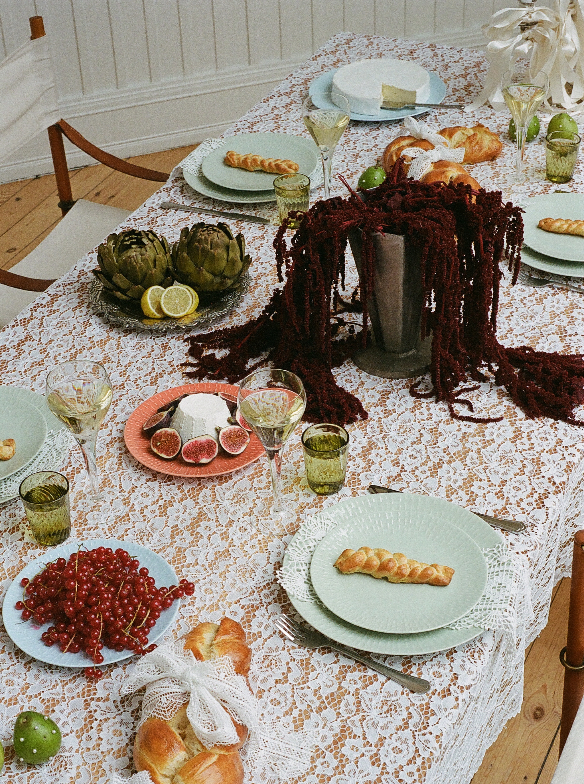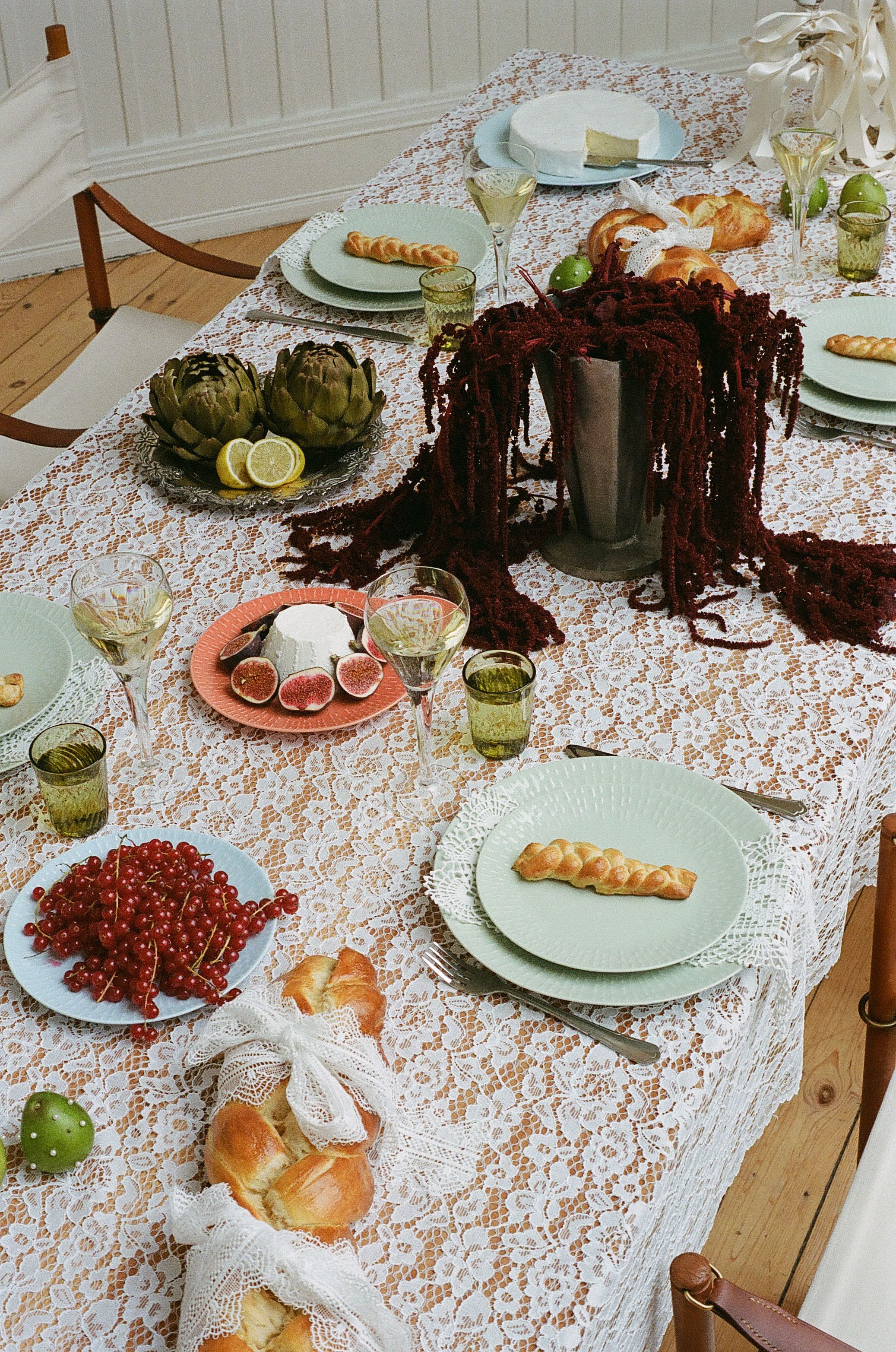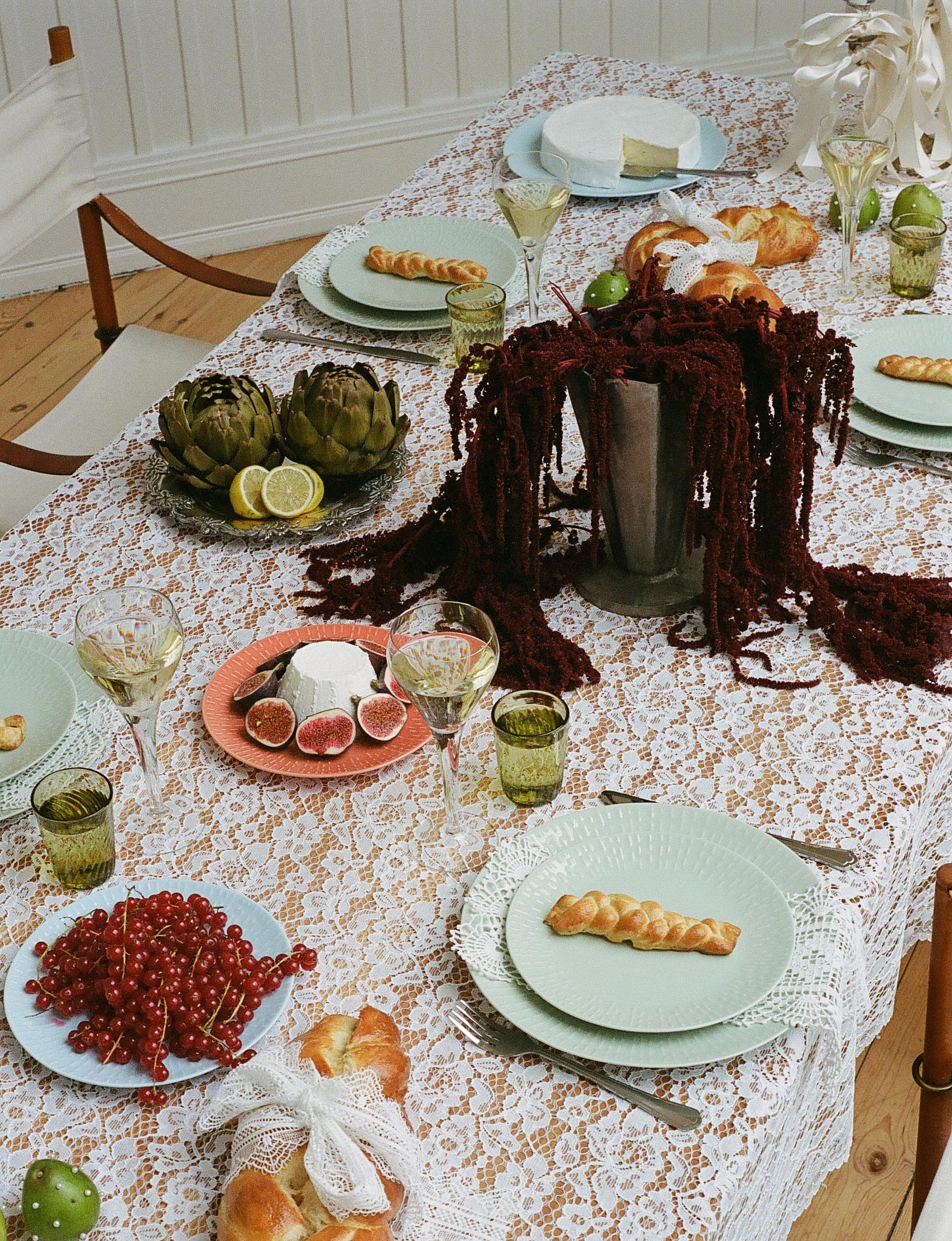 Ta ut svängarna när det är dags för fest och satsa på en dukning där more is more. En duk i spets blir en fin bas till färgerna aprikos, aqua och pistage. Placera ut en bukett som tar för sig och en maffig kandelaber dekorerad med sidenband och pärlor så är feststämningen på plats!