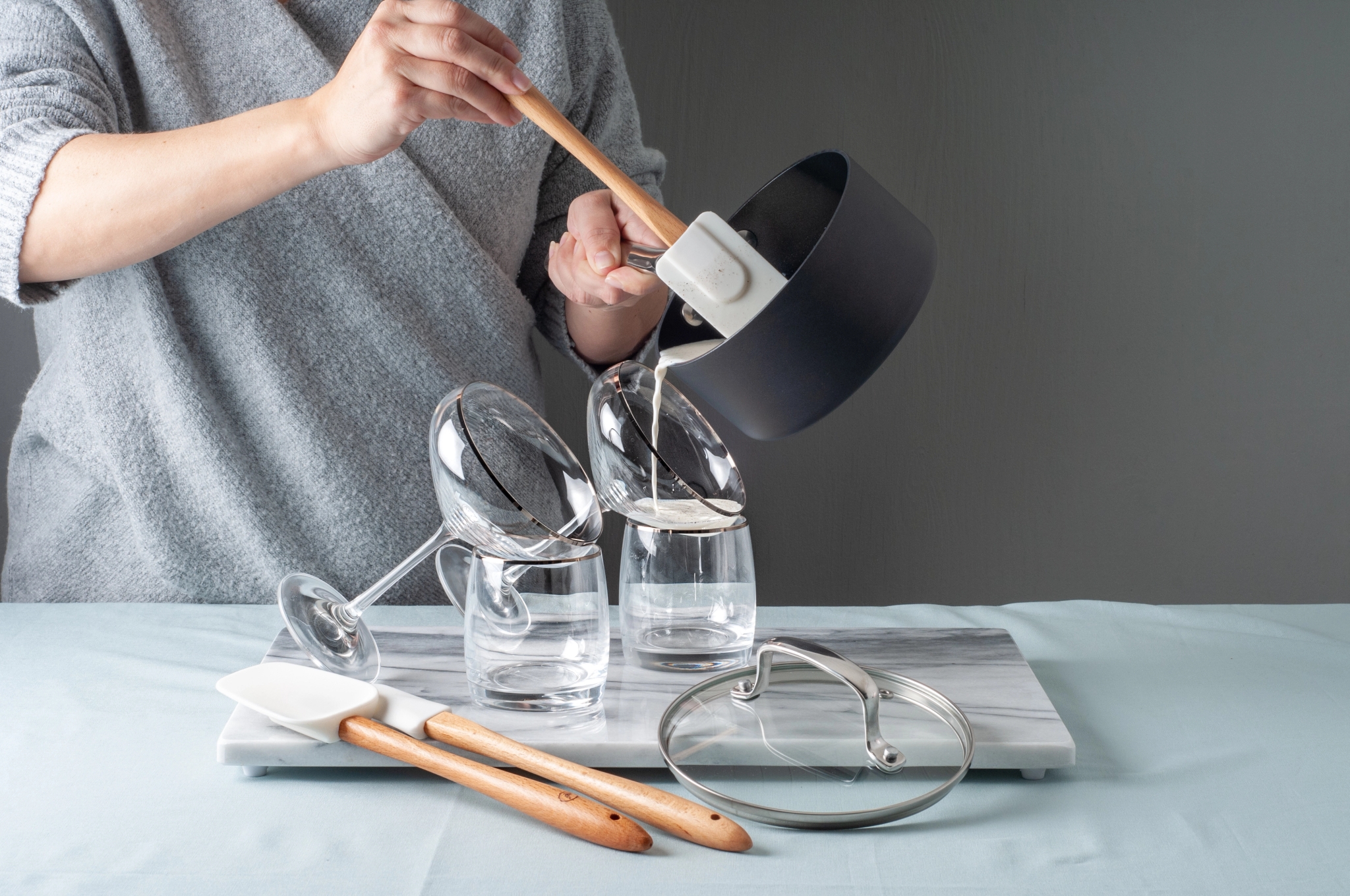 7. Rör samman saften från hallonen med grädde i en kastrull, koka upp och ställ åt sidan för att svalna.