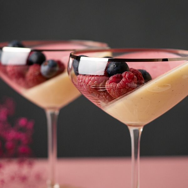 Krämig söt och syrlig vit choklad- och hallonpannacotta i champagneskålar
