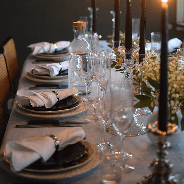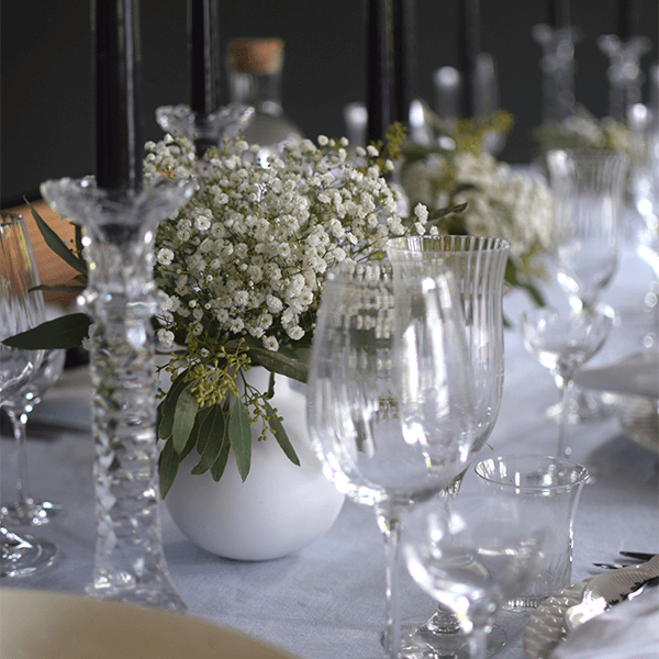 - Avslutningsvis: Det viktigaste för dukningen är att gästerna får plats med sina armar och kan se varandra. Hur vackert det än är med stora blombuketter kanske det bara blir störande för samtalen. Ställ då buketten i inte i mitten utan på bordsänden.