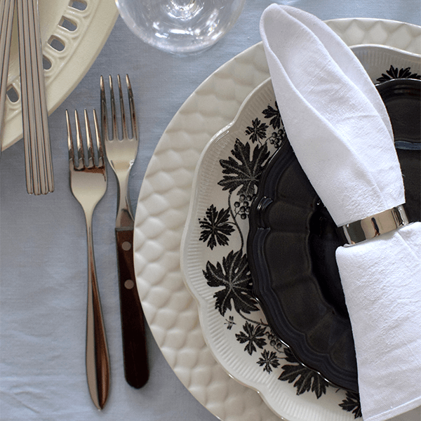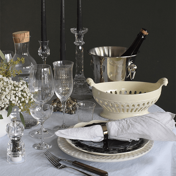 Det personliga och unika ligger i din egna mix. Du har köpt nya tallrikar, använder de ärvda besticken och de fyndade antika vinglasen. En övning är att tänka nästa gång det behövs kompletteras glas tex: kan jag hitta några antika vinglas istället för att köpa nyproducerat. Några glas som har en helt annan stil, färg och karaktär än de moderna du redan har. Ditt bord blir helt unikt och ditt. Dina noga utvalda ting som välkomnar till bords.