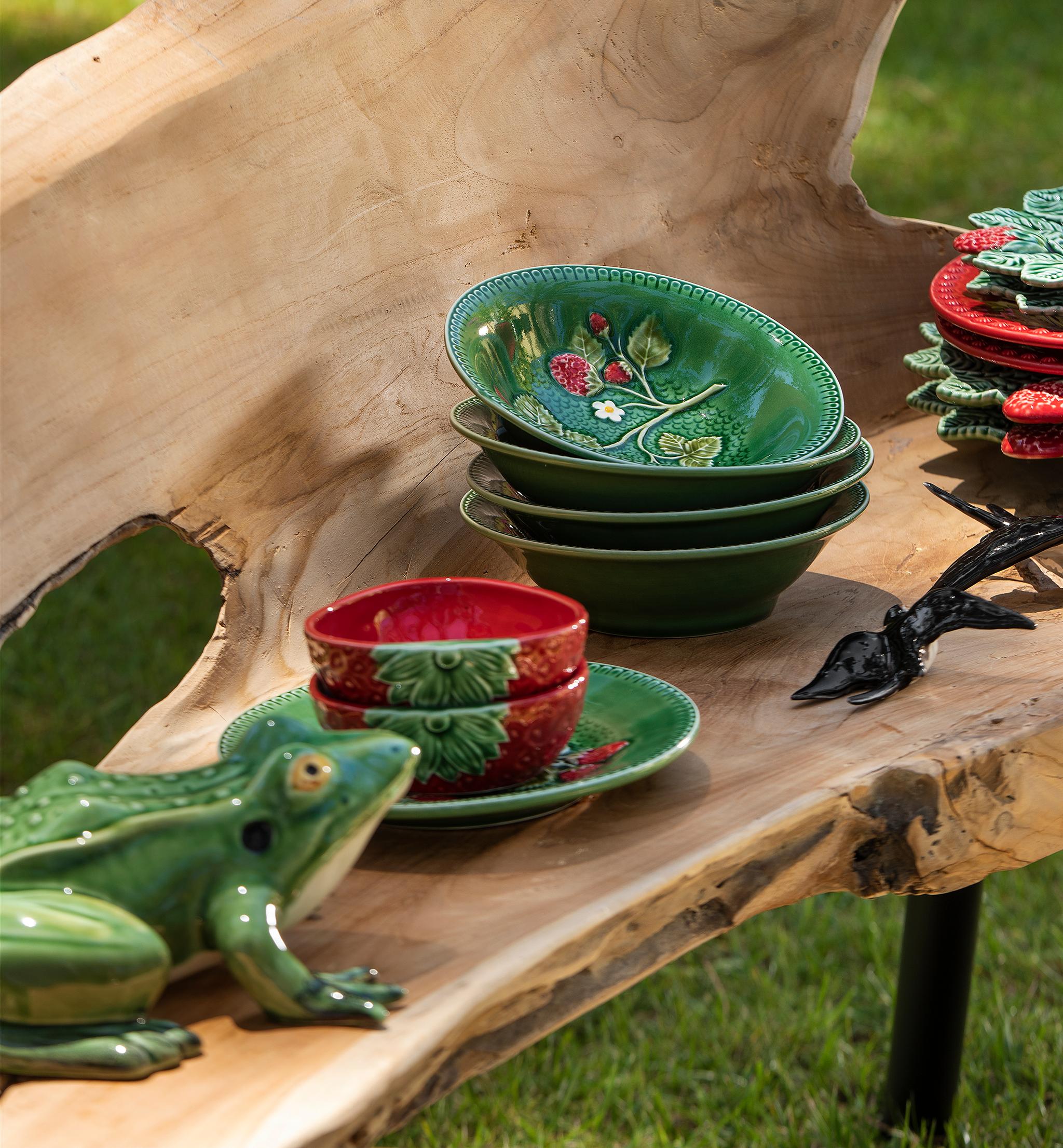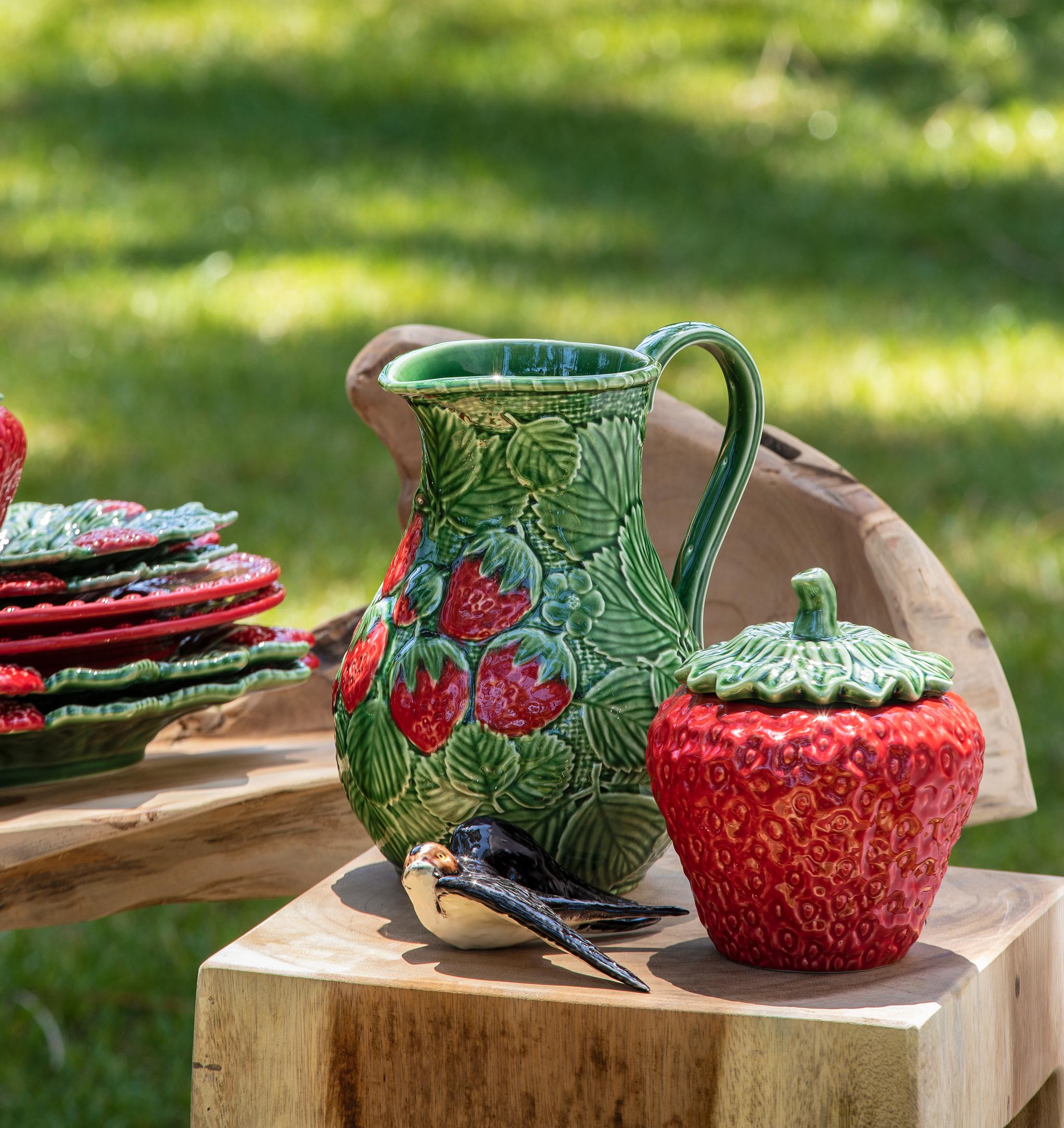 Att duka upp till en somrig fika eller servera jordgubbarna till efterrätten i skålarna från Bordallo Pinheiros serie Strawberries sätter verkligen sommarkänslan på bordet. I serien finns en vacker kanna, en burk med lock och två skålar. Blanda gärna dessa delar med skålarna från serien Countryside Leaves eller faten från serien Cabbage från Bordallo Pinheiro.