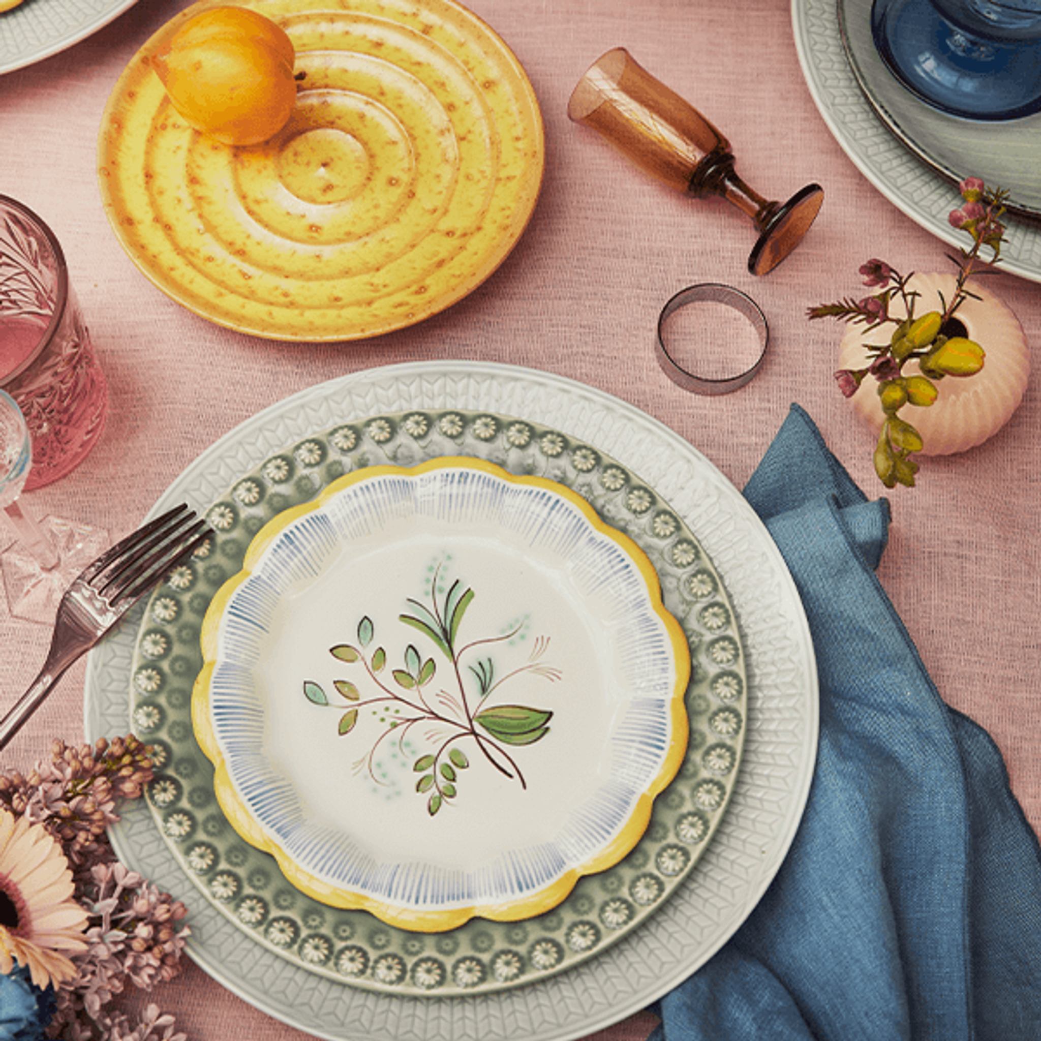 Duka med allt som får dig att bli lycklig. Mixa färger, mönster, texturer och former för att få till en sommar-maximalistik känsla - håll inte igen. Tänk att dukningen ska bli ett samtalsämne i sig. Plocka fram sådant som du redan har och addera nytt som du kan spara för tillfällen längre fram. Ett par oväntade ljusstakar på festbordet blir fina att ställa i fönstret när sensommaren drar in senare, exempelvis.