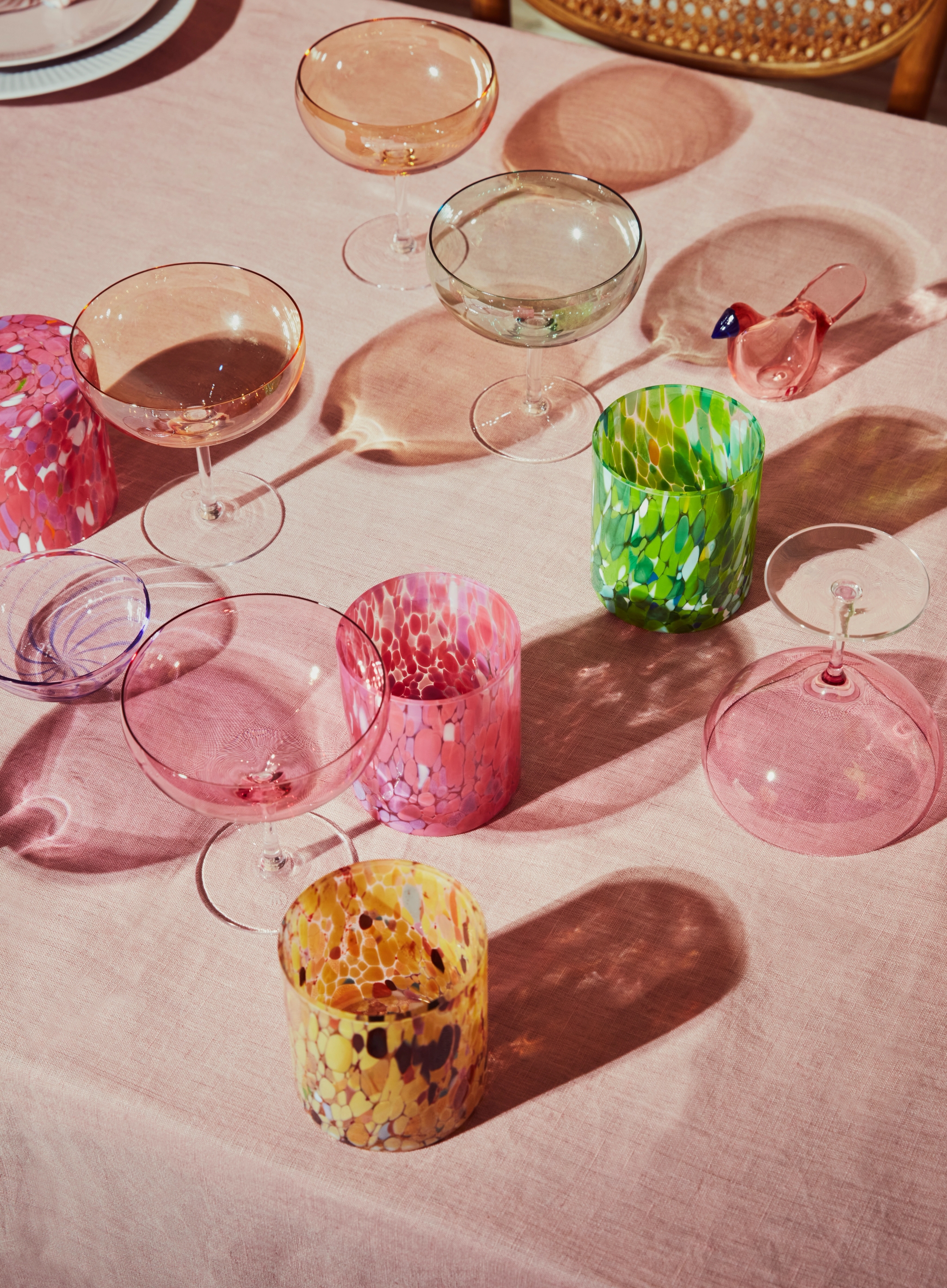 En av den här sommarens största trender när det kommer till dukning är att gå all in på de färgade glasen. Vågade ta ut svängarna och tillför än mer karaktär till bordet, där det inte stannar vid färgglatt porslin eller textil. Och vill du vara extra djärv - varför inte skåla in festen med färgglada och mönstrade glas på fot. Snacka om pricken över i!