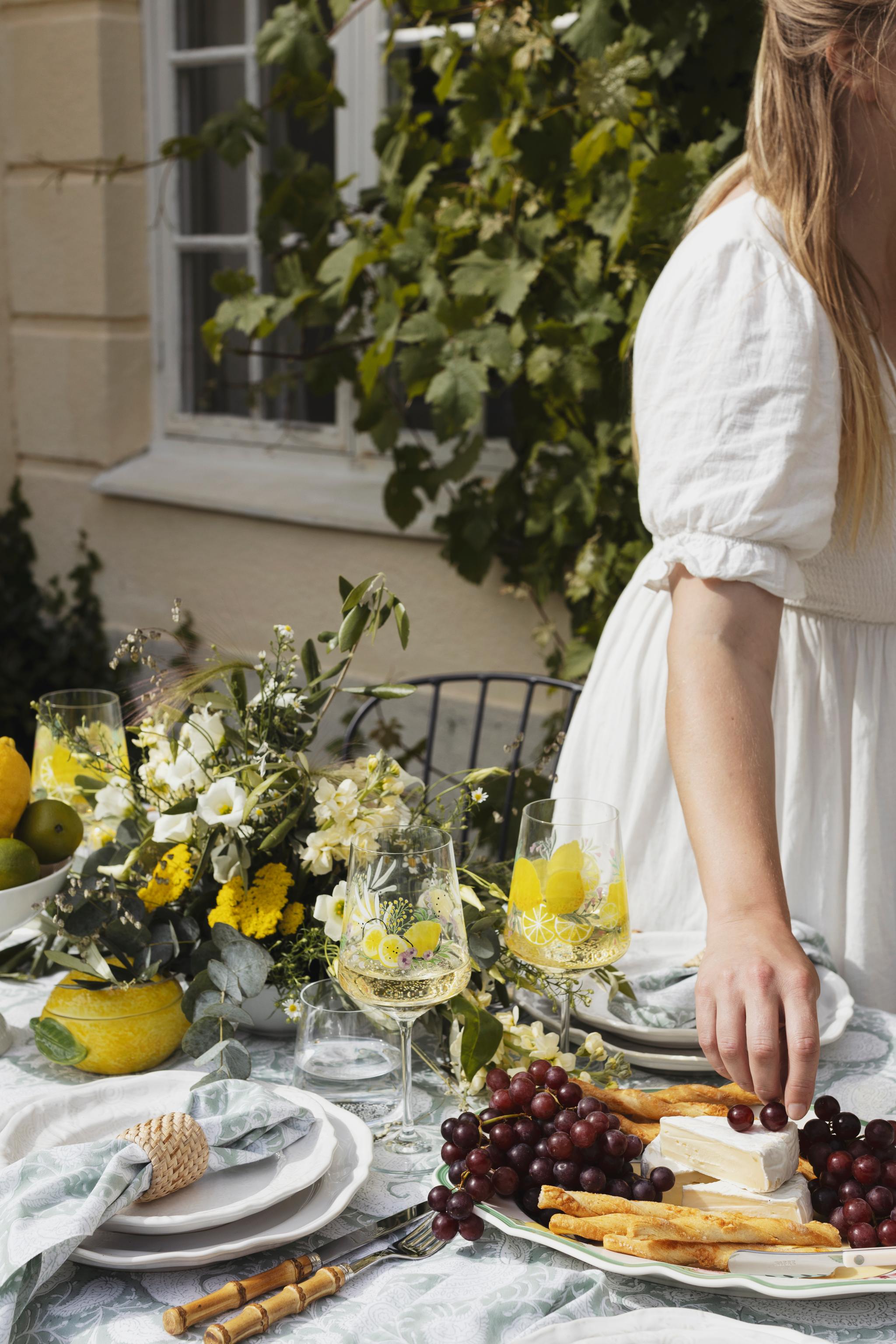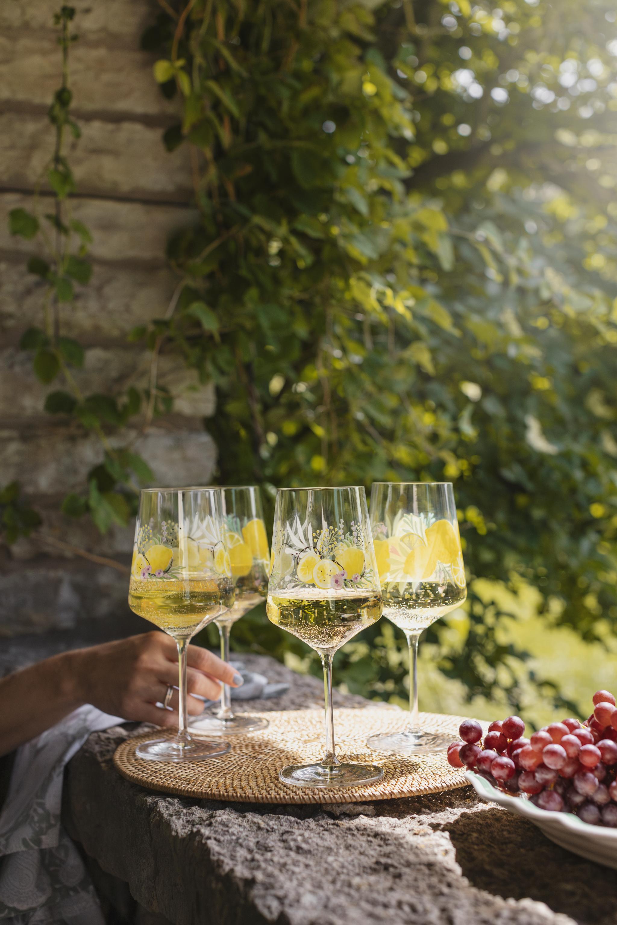 Ställ fram vinglas för vitt vin och färgglada vatten- eller lemonadglas i olika nyanser av blått och grönt, som påminner om det klarblå Medelhavet. Våga även satsa på glas med mönster, kanske med citrusmotiv. Servera kyld limoncello, vitt vin, eller hemgjord citronlemonad med massor av is!