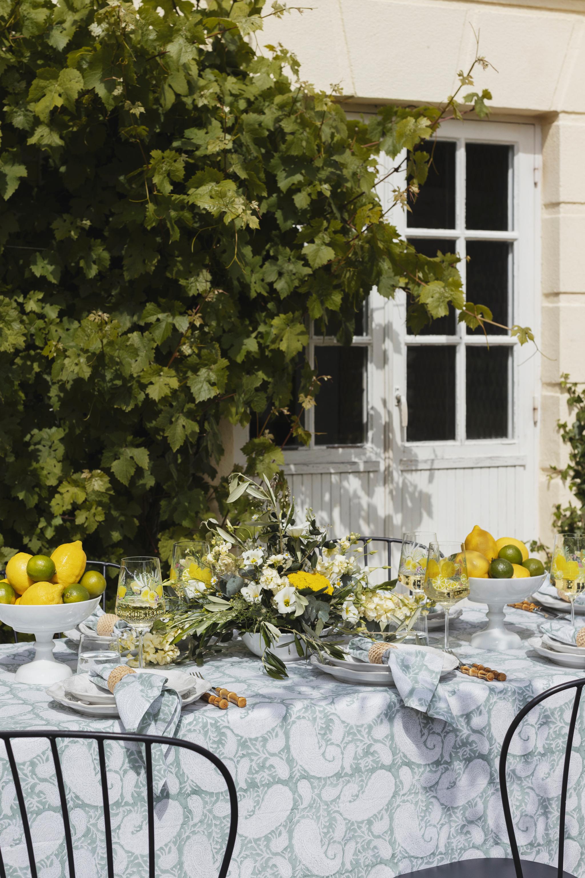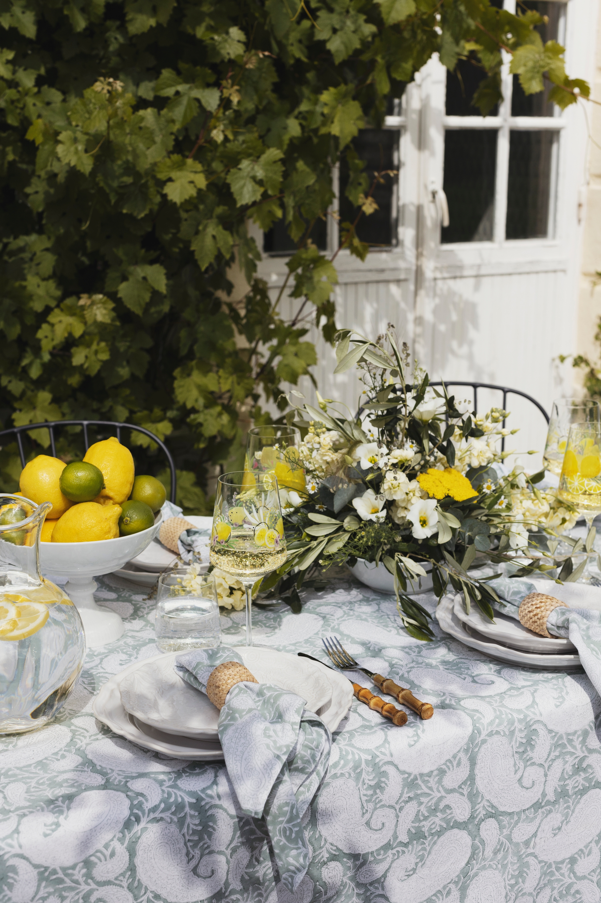 Vad är en dukning utan blommor? Skapa enkla arrangemang med vita och gula blommor, som margueriter, solrosor eller citronblommor som du ställer i terrakottakrukor eller glasvaser. Sprid ut färska citroner, lime och apelsiner längs med bordet för att verkligen få den där medelhavskänslan. Lägg till olivgrenar eller färska örter som rosmarin och basilika för extra grönska och doft!