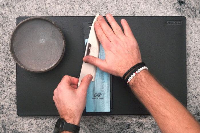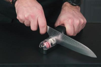 Håll efter din kniv genom att skärpa den med jämna mellanrum. En våtslip passar utmärkt för det dagliga underhållet. Allt du behöver göra är att fylla knivslipen med lite vatten och dra några drag med kniven igenom de olika hjulen, så blir skärpan som ny.