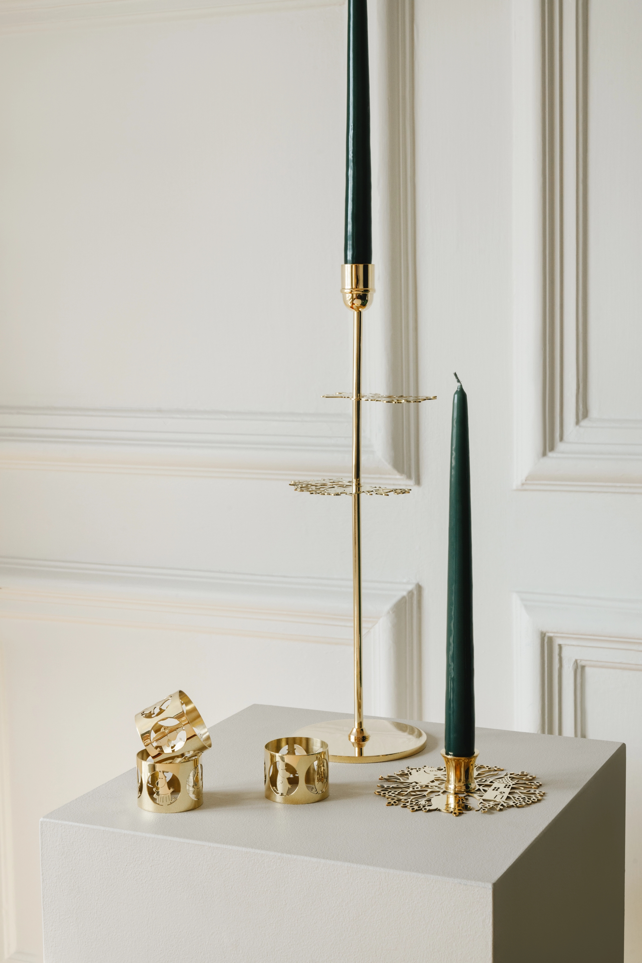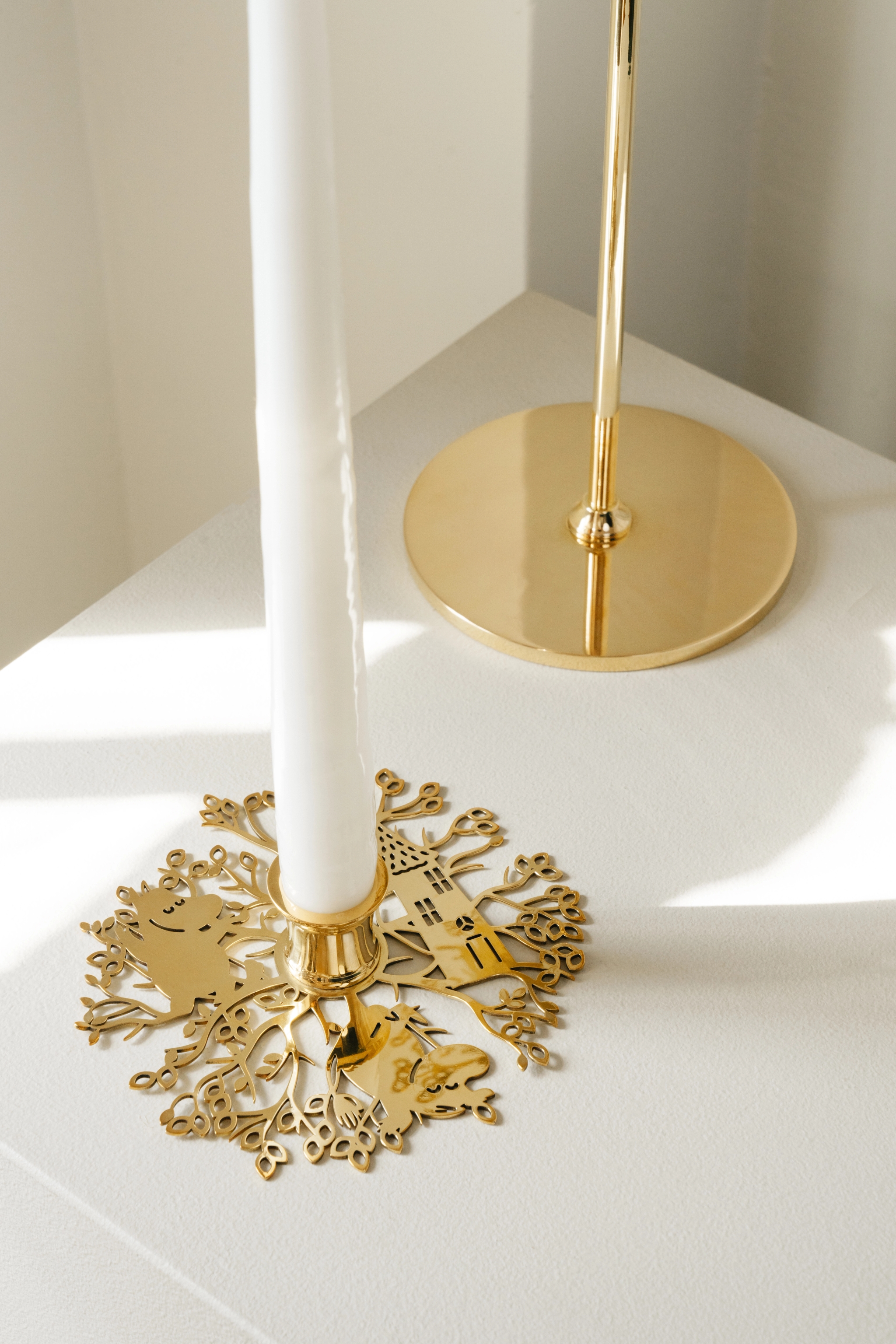 I kollektionen ingår två ljusstakar som utstrålar elegans genom sin distinkta design. Både den låga och den höga ljusstaken är vackert illustrerade och inspirerade av den första boken om Mumin där karaktärerna i berättelsen gömmer sig i trädgrenarna för att skydda sig från stormen. Ljusstakarna finns i två olika utföranden – i massiv mässing eller i förnicklad mässing.