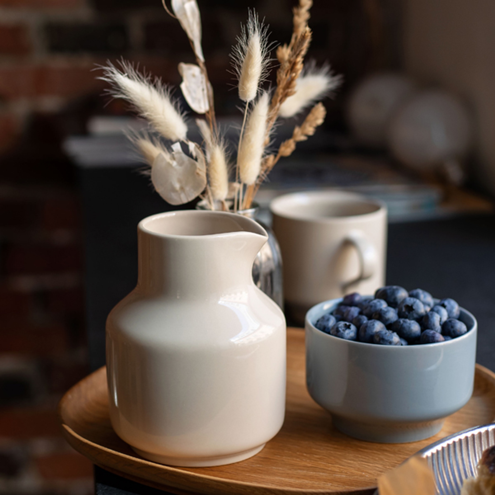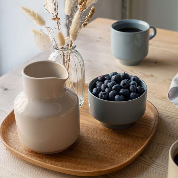 Serien består av mugg, tallrik, assiett, serveringsskål, kopp och kanna i stengods samt träbricka i ek.