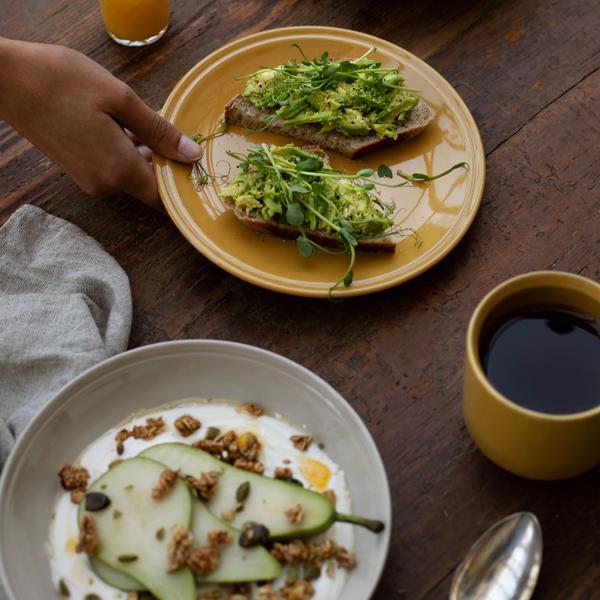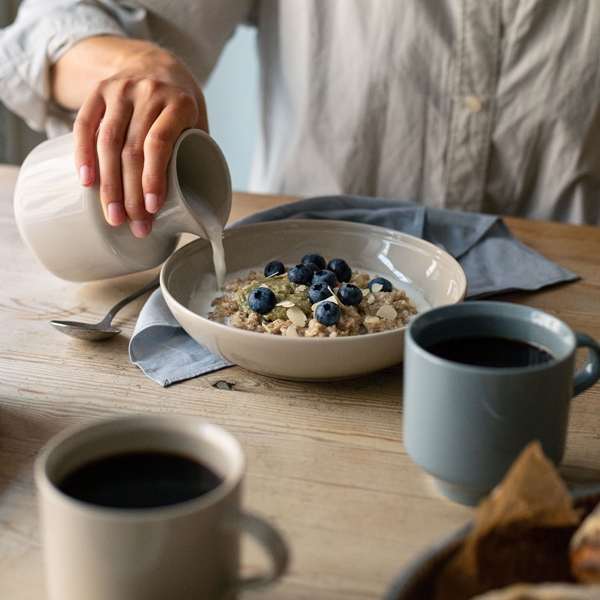 Höganäs Keramik Daga är en enkel, elegant och lekfull servis av hög kvalitet som är anpassad för vardagens olika måltider, från familjefrukostar och fikapauser till en festligare middagsdukning. Färgerna är inspirerade av Kullabygdens lera, disiga himlar och senapsgula rapsfält.
