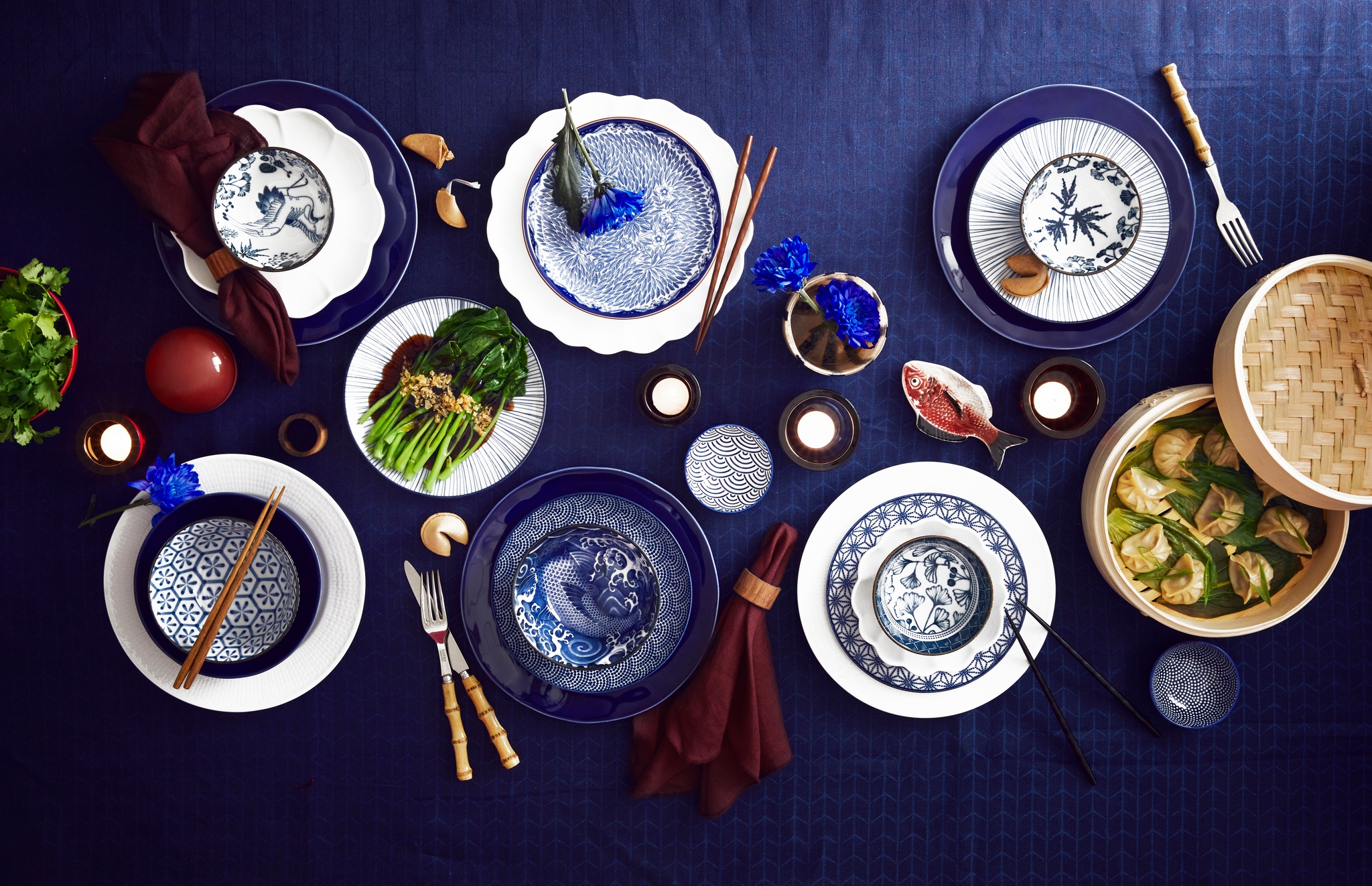 - Använd gärna blommiga, mönstrade eller gyllene tallrikar. Om du har möjlighet kan du välja porslin med symboler som drakar, fenixar eller kinesiska tecken.