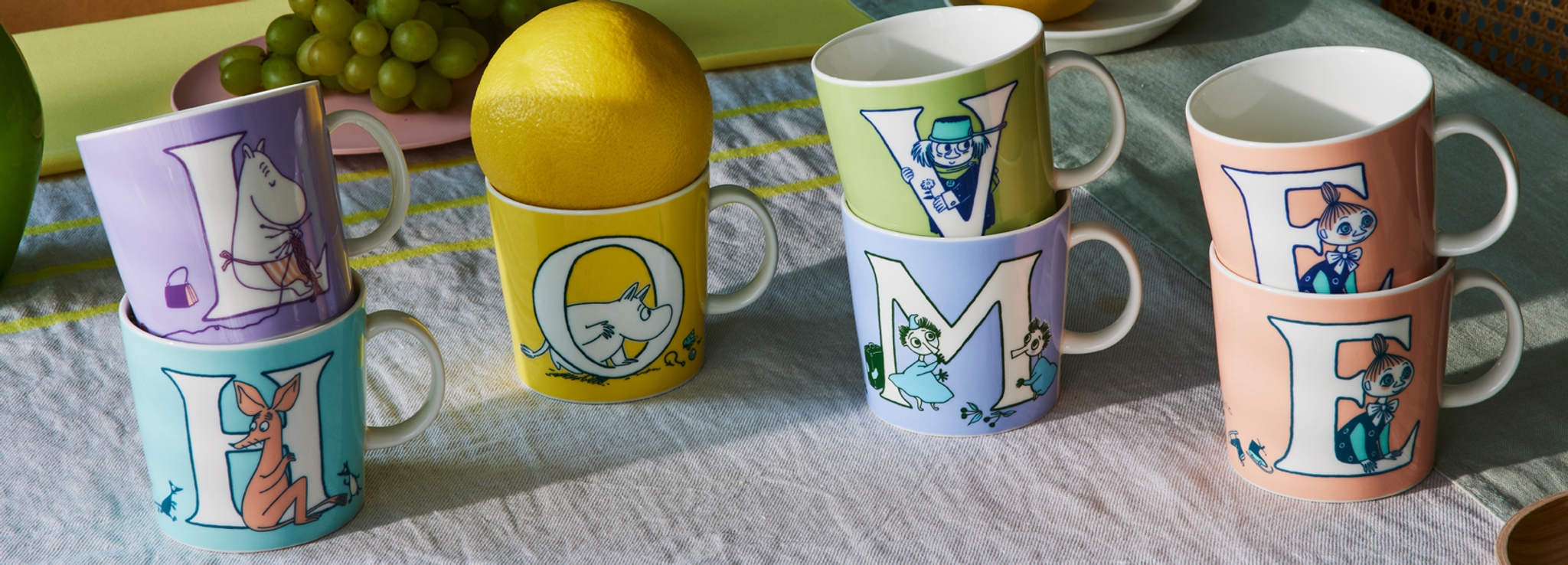 Moomin by Arabias alfabetskollektion består av Muminmuggar med bokstäver. Bokstäverna är baserade på Tove Janssons handritade bokstavsillustrationer och varje mugg visar en karaktär från Mumintrollens magiska värld. Muggarna rymmer 0,4 L.