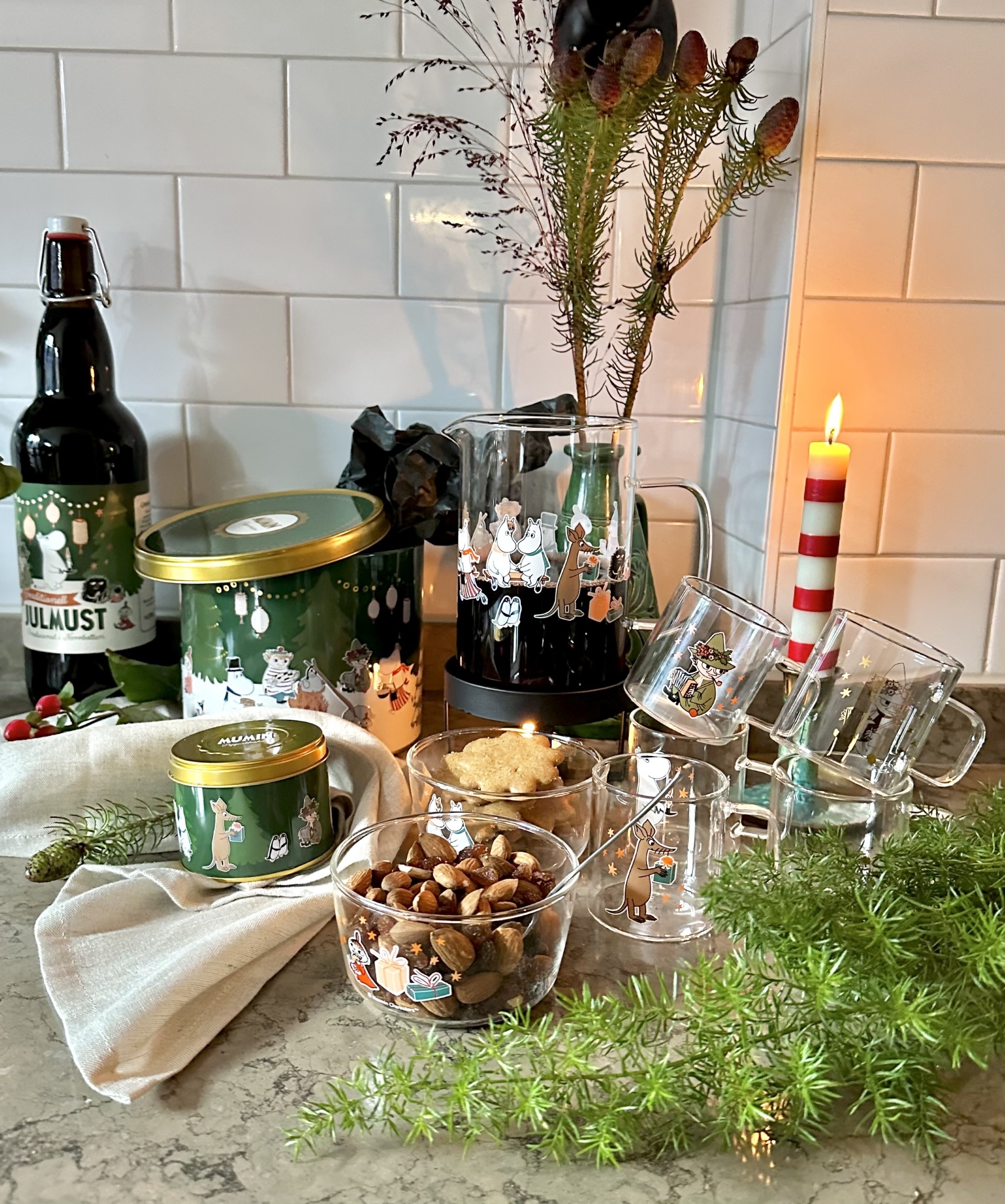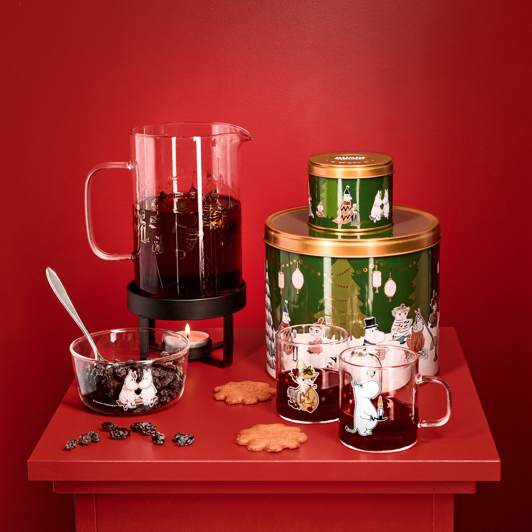 Tillsammans gör vännerna från Mumindalen åter ett kärt gästspel på Cervera lagom till advent, och pryder både glöggmuggar, en glöggkanna med stativ, skålar – och en massa godsaker: Handpackade chokladpraliner, två pepparkaksburkar i olika storlekar från svenska Finsmakeriet, en julmust samt en ekologisk och KRAV-märkt glögg.