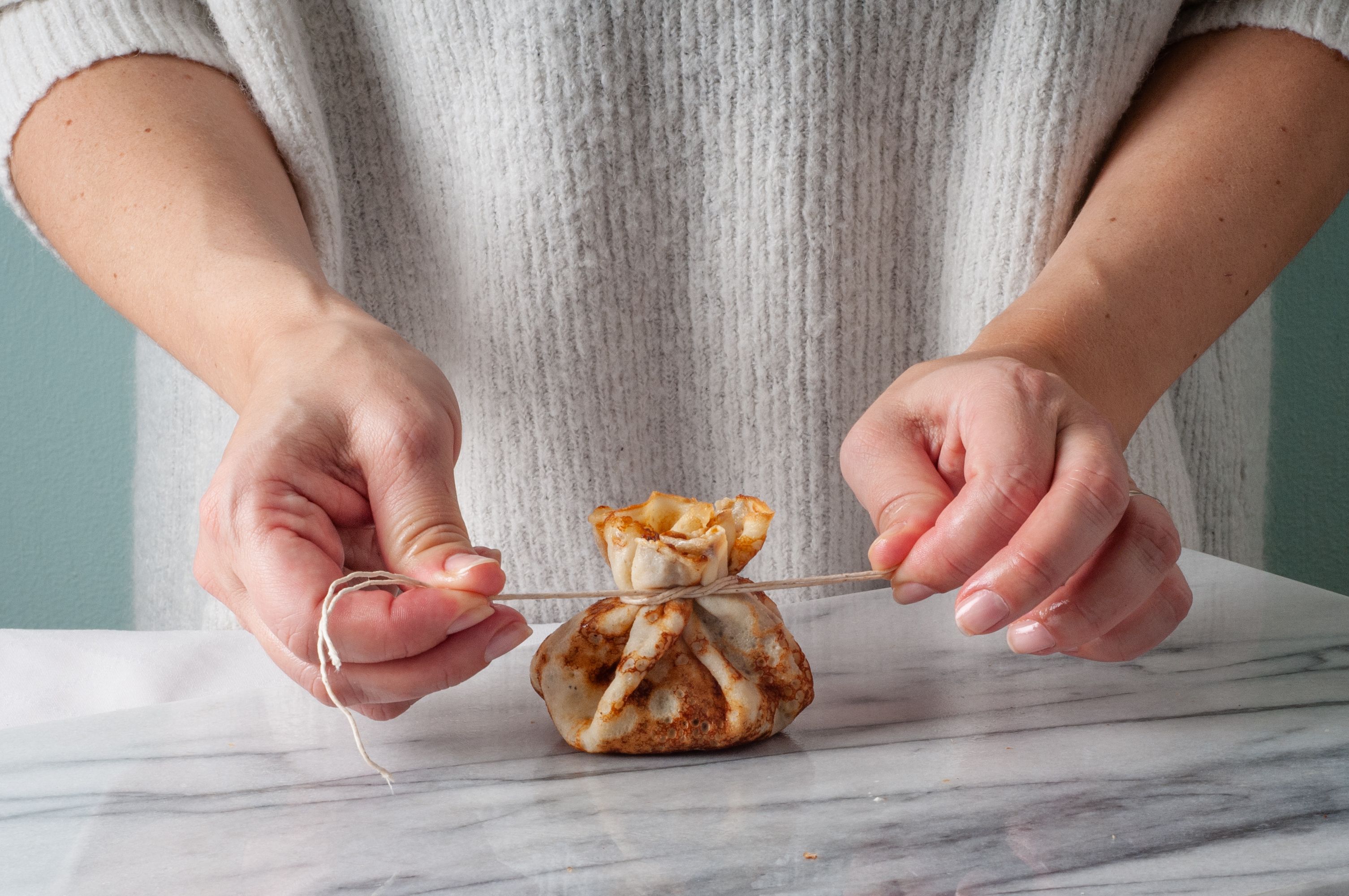6. Lägg mandelmassa och grädde i mitten av pannkakan. Samla ihop kanterna och knyt försiktigt ihop pannkakan till ett knyte. Pudra med florsocker.