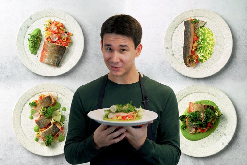 Rätten som Filip har lagat och ska lägga upp på fyra olika sätt är stekt röding med grön puré och sauterade grönsaker. Han har även förberett garnering i olika färger och former, allt ifrån färska örter och kryddkrasse till tunt skivade grönsaker.