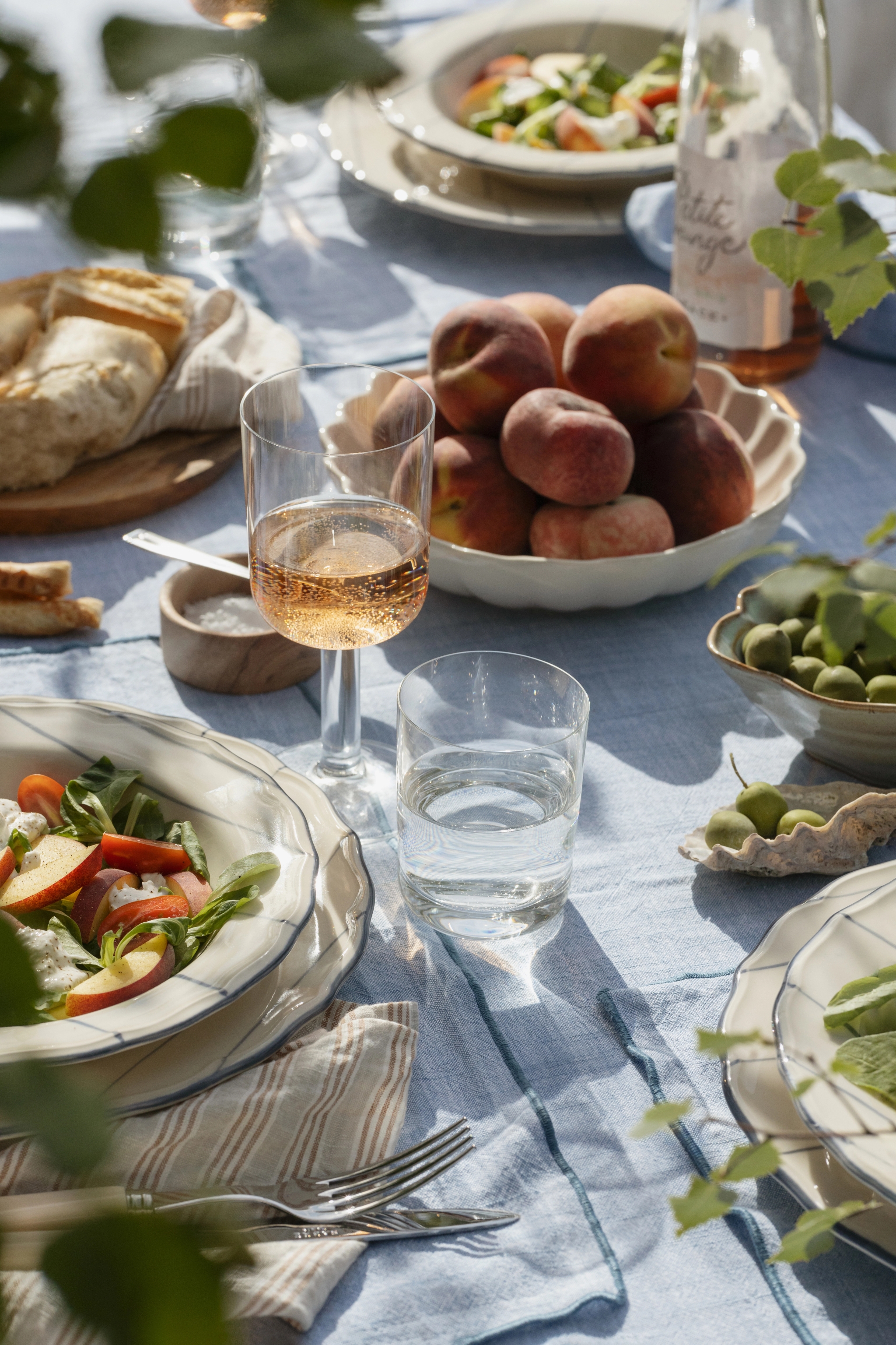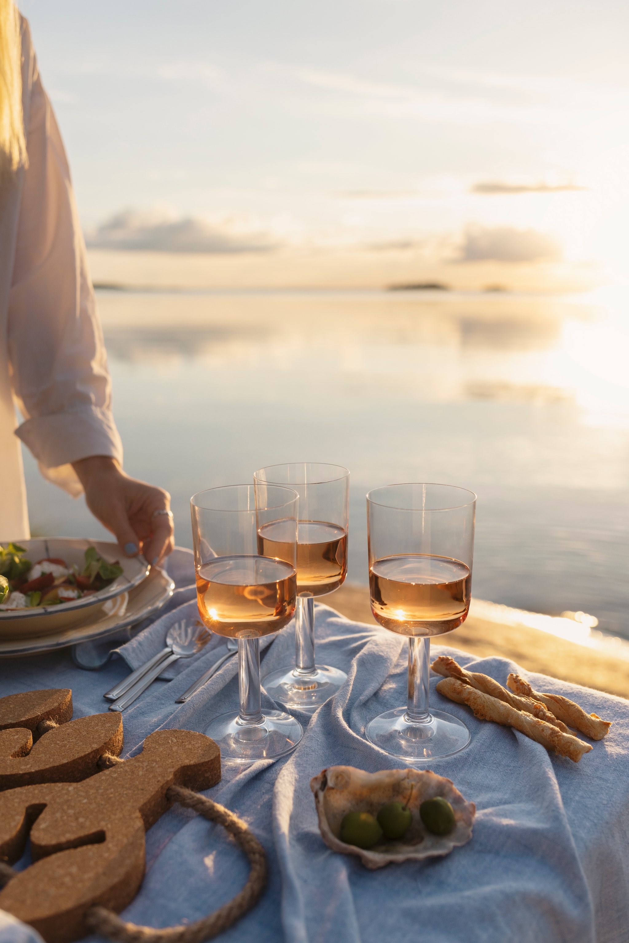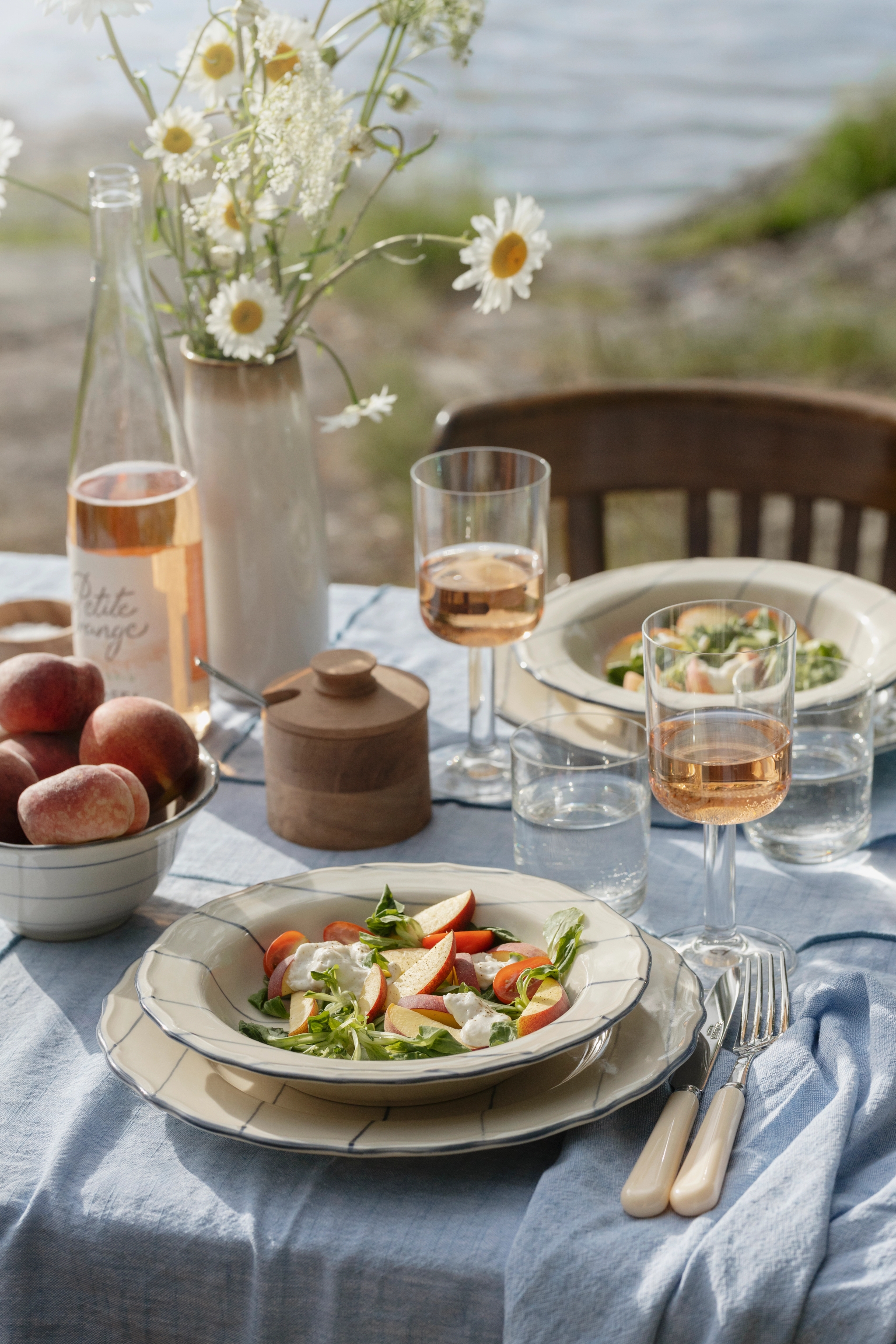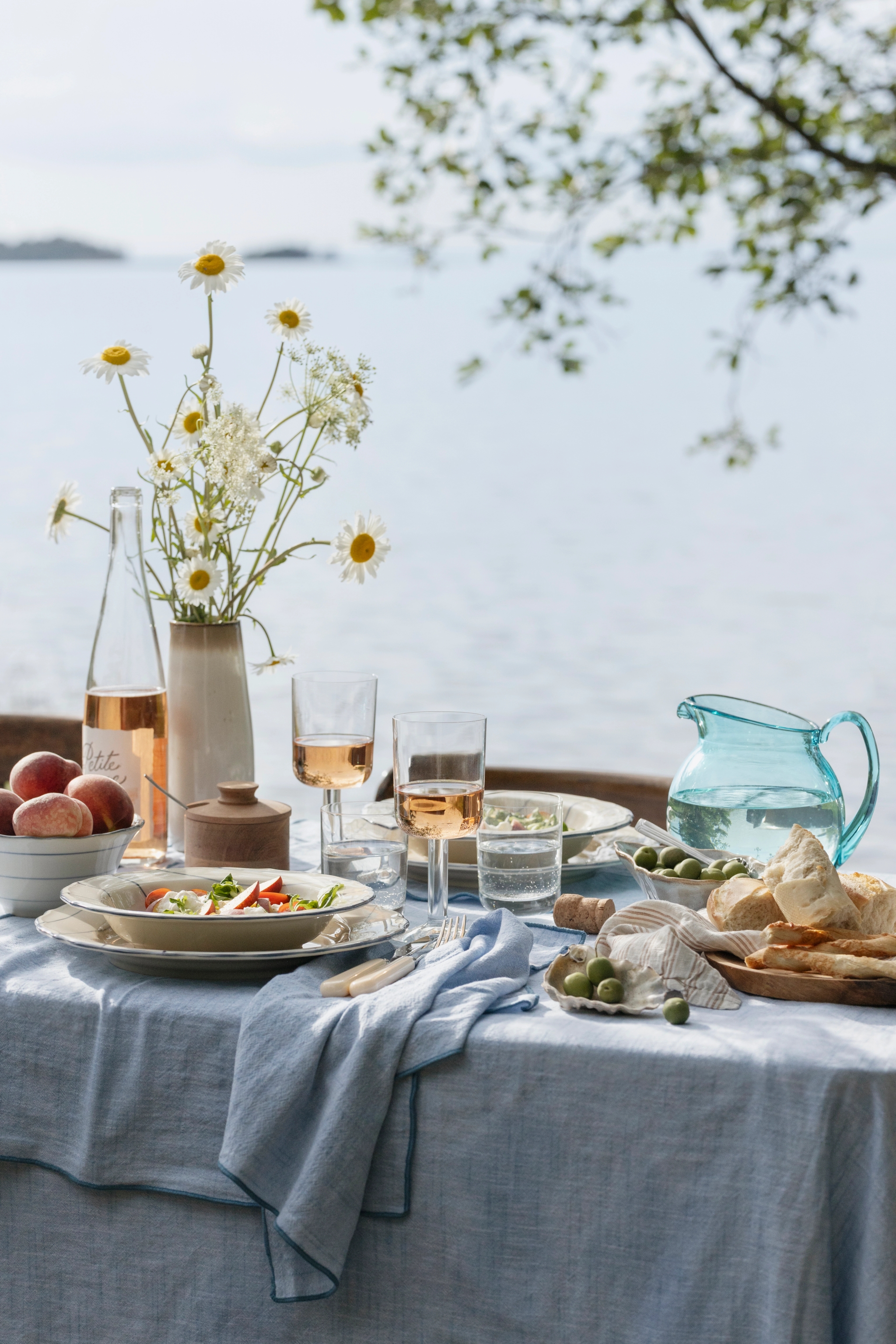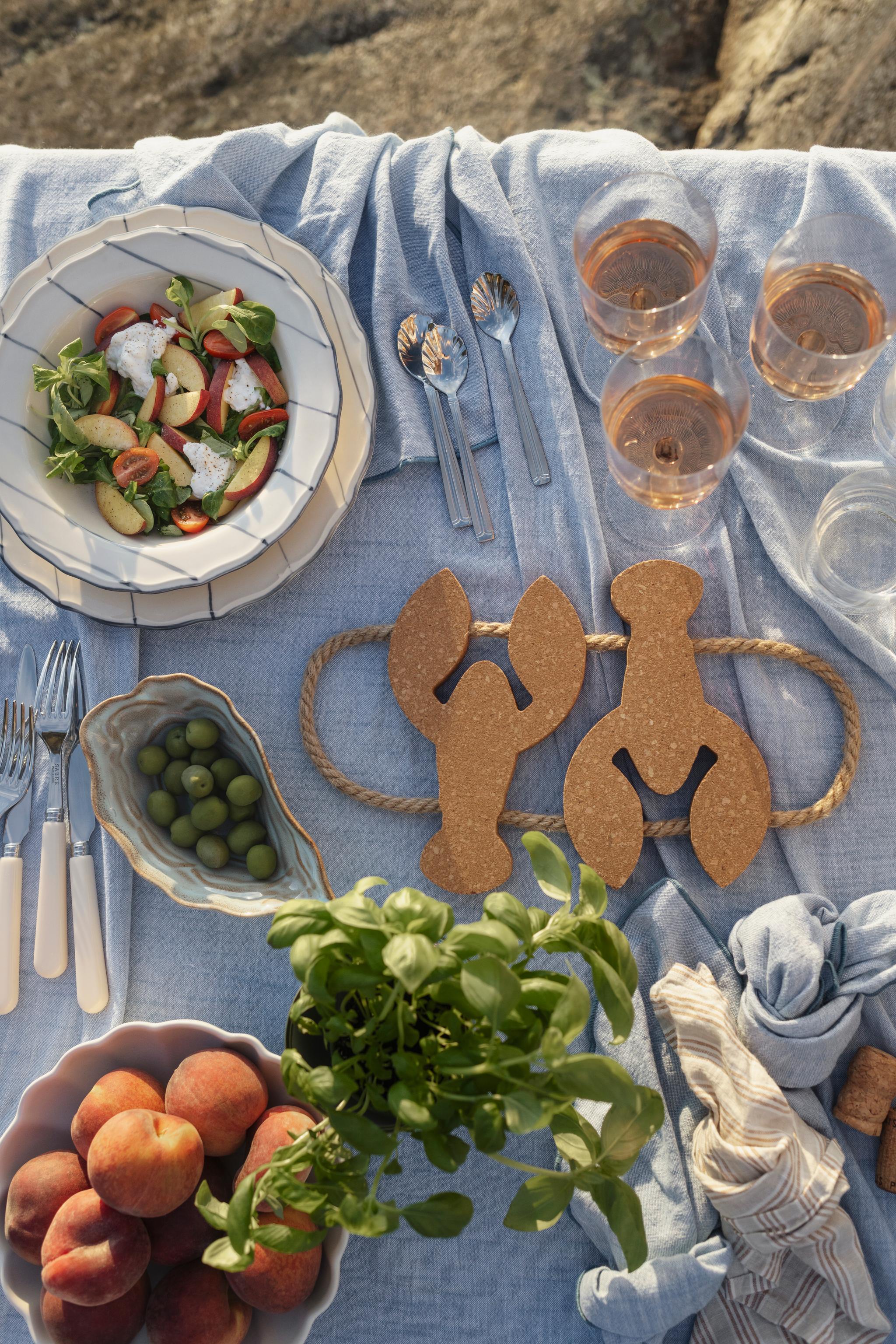 Använd en vit, sandfärgad eller blå bordsduk för att framhäva det randiga porslinet. Upptäck exempelvis dukarna, och servetterna, från Stiernholms serie Eline. Alternativt kan du använda en löpare av jute eller grovt linne för en mer rustik känsla. Lägg tallrikarna på flätade underlägg av sjögräs för en extra skärgårdskänsla. Matcha med enkla, eleganta bestick i rostfritt stål eller med trähandtag för att förstärka det naturliga temat. Välj servetter i linne, antingen i en neutral färg som beige eller i en accentfärg som marinblå. Knyt dem med snöre eller använd servettringar i trä eller metall! Duka med enkla, klara glas för vatten och vin. Om du vill sätta extra pricken över i kan du välja glas med en lätt blå ton för att matcha det marina temat. Servera uppfriskande drycker som citronvatten, iste eller en svalkande somrig bål i stora karaffer.