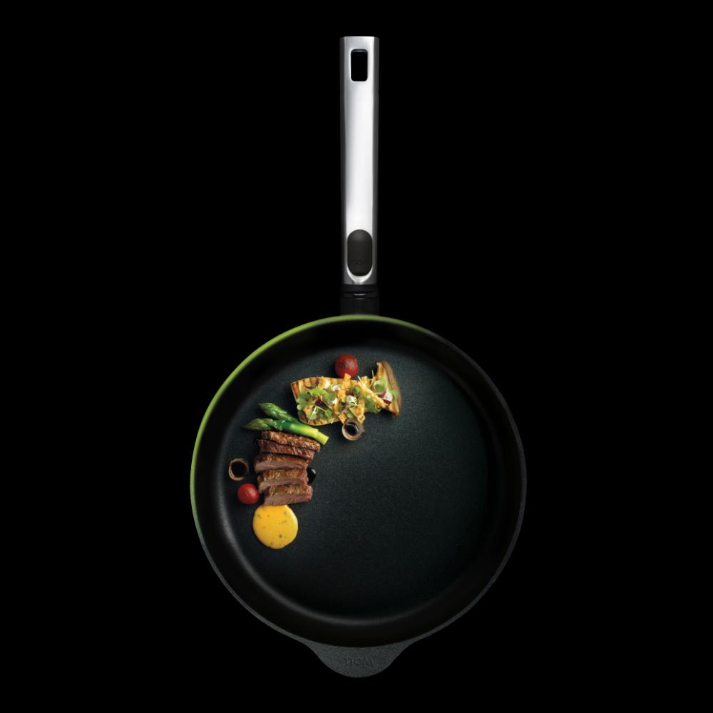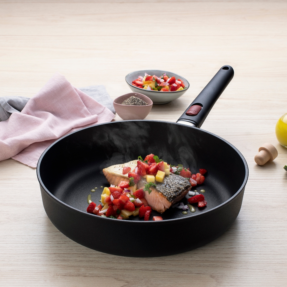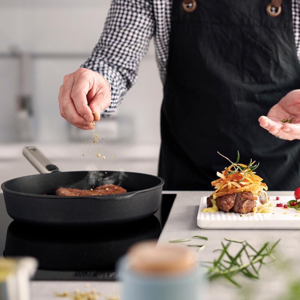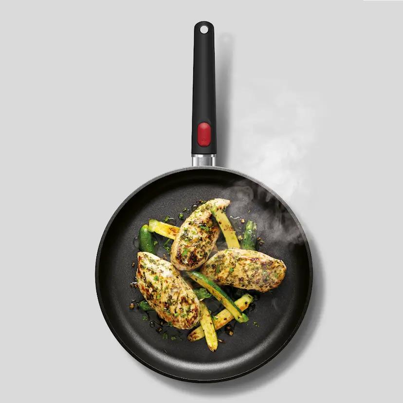 - Den klassiska stekpannan i 28 cm är stor och robust - perfekt för att steka exempelvis större biffar och större volymer. Den har samma goda beläggning som hela serien har. Pannan tål ugn. Handtaget kan inte användas i ugnen, och behöver tas av.