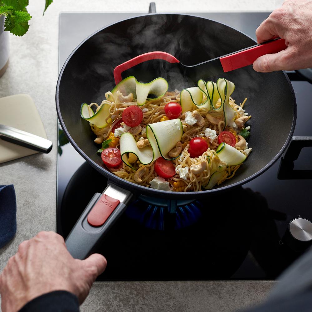 - Den rymliga wokpannan med femskiktsbeläggning. Beläggningen också av bland annat diamantpartiklar vilket resulterar i en hållbar och reptålig wokpanna. Wokpannan är kompatibel med alla värmekällor.