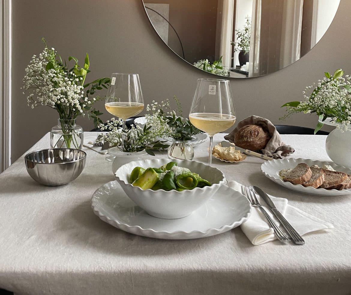 - Då färgskalan är djärv i sig är det klokt att hålla dukningsattiraljerna rätt så avskalade. Duka exempelvis med ett neutralt och avskalat porslin, vitt exempelvis. Men hitta en serie som ändå har karaktär, exempelvis Eira från Stiernholm.