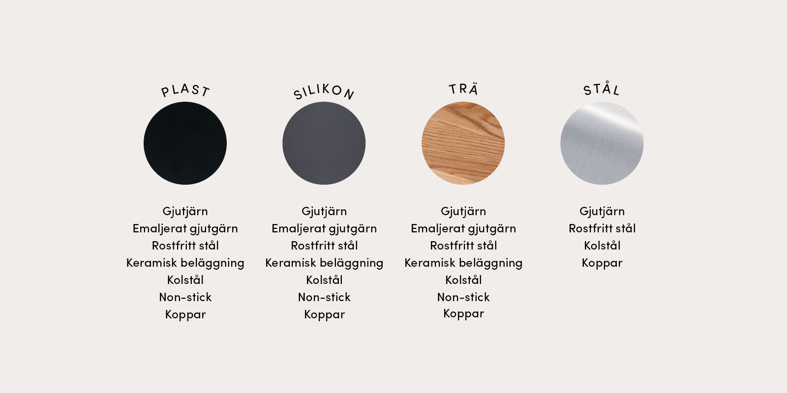 Det är viktigt att stekspadens material passar din stekpanna så att den inte förstör beläggningen/ytan på pannan. Nedan ser du vilket material som passar vilken panna.