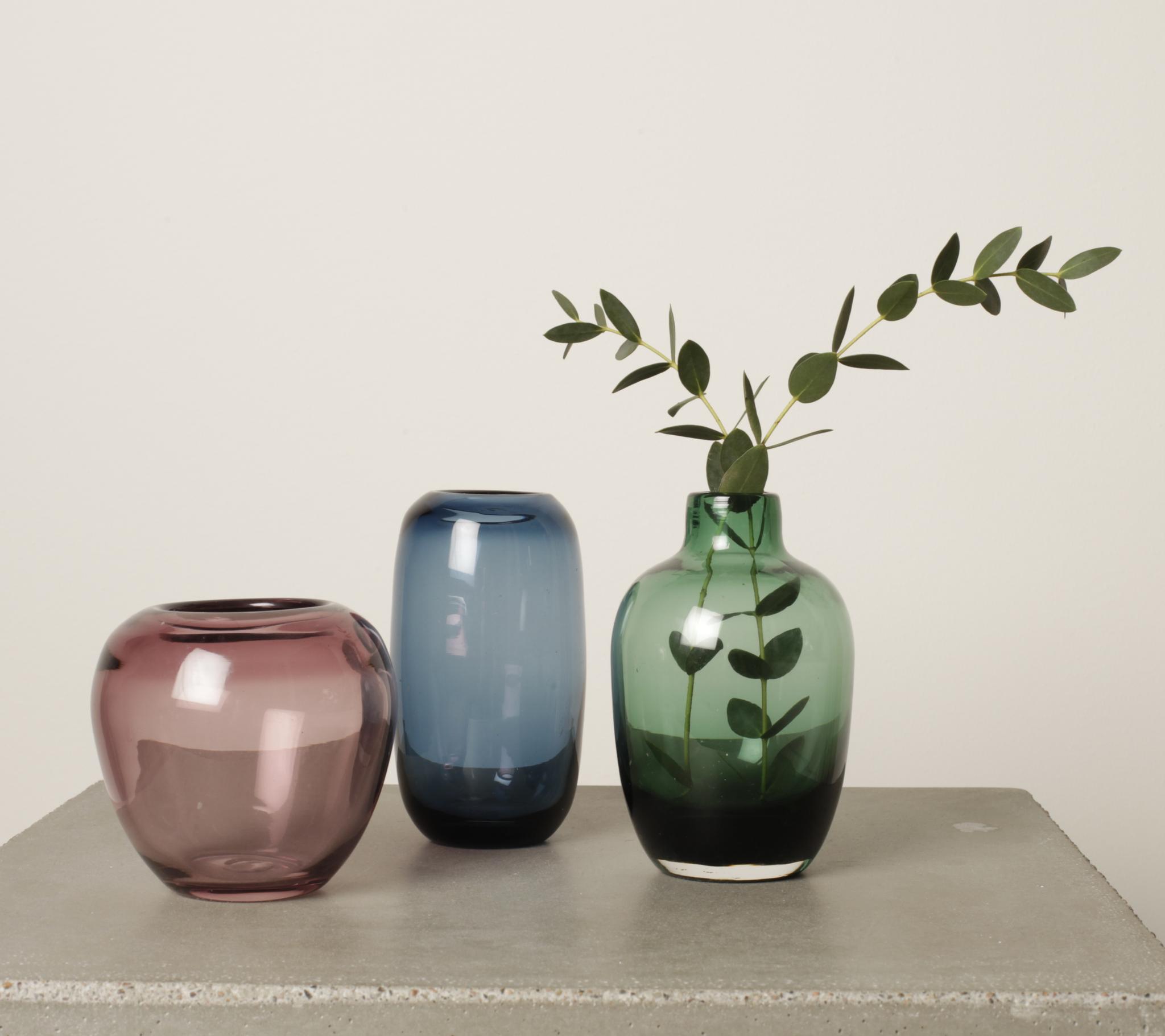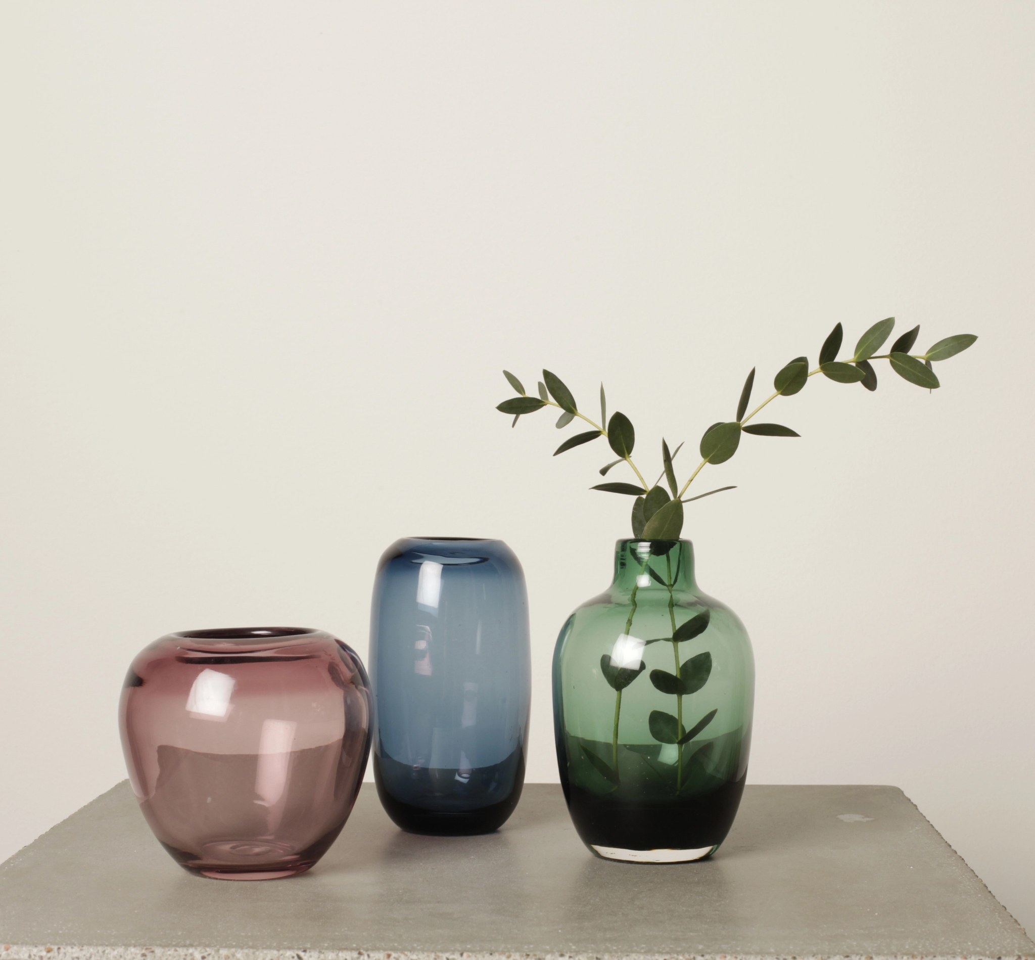 De runda vaserna med sina smala öppningar är perfekta till fylliga och frodiga buketter. Den öppna basen gör att stjälkarna får gott om plats, medan den smala öppningen håller ihop blommorna och gör att de kommer till sin rätt upptill. Detta är den mest användbara vasen för klassiska snittblommor.