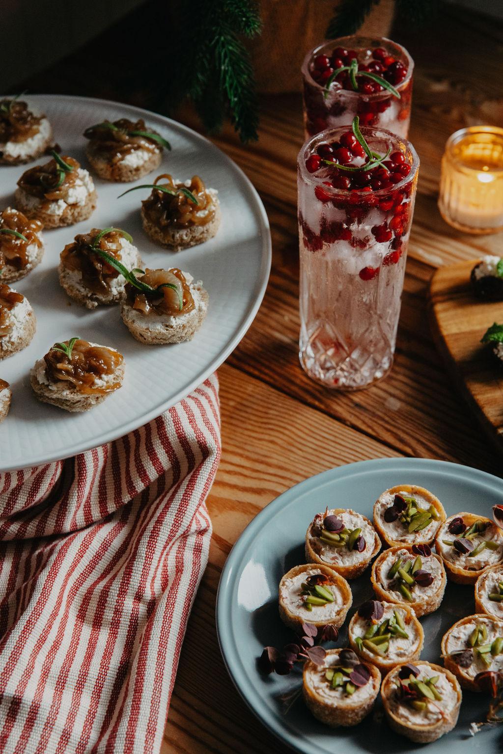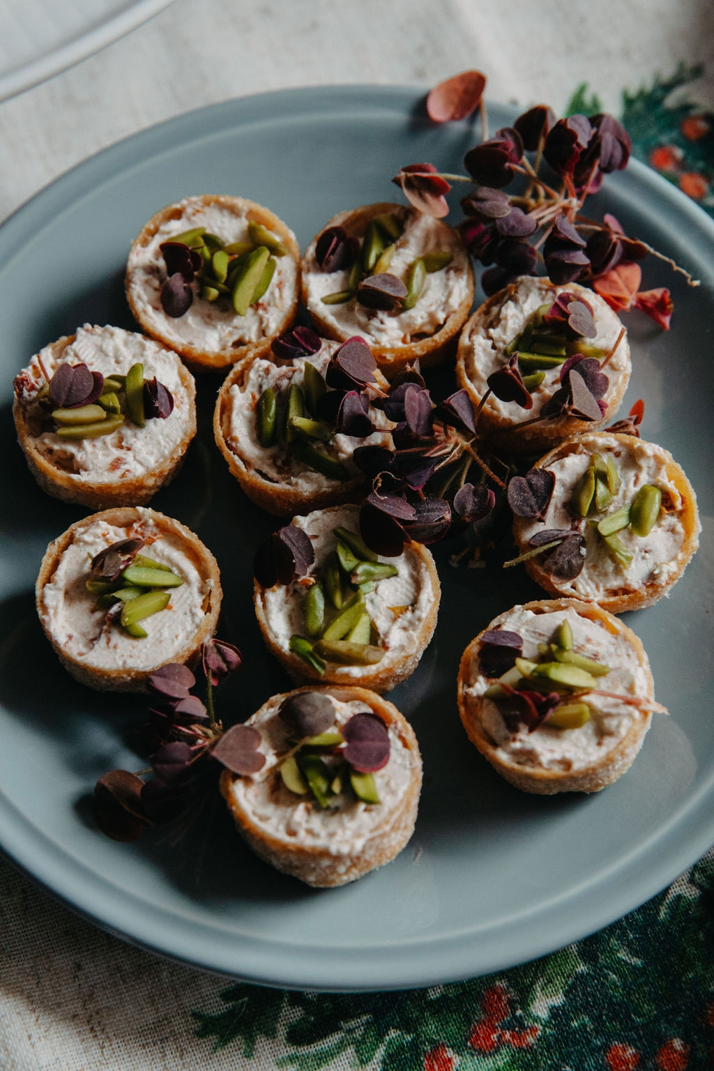 3. Fyll krustaderna med ostblandningen och toppa med pistagenötter och ätbara blommor eller färska örter.