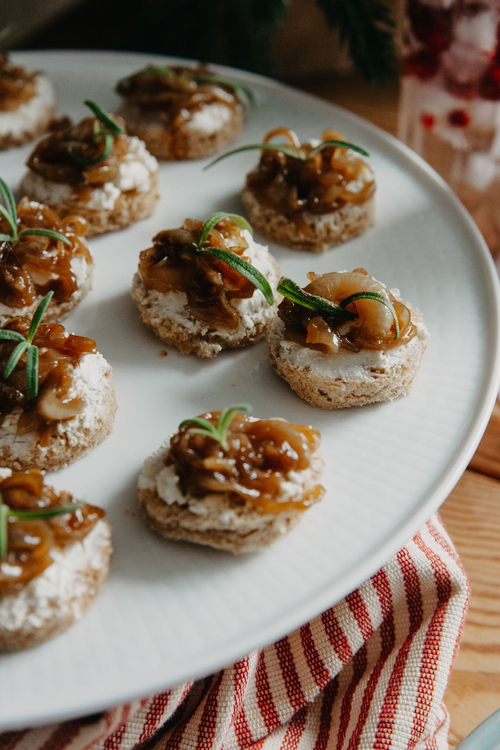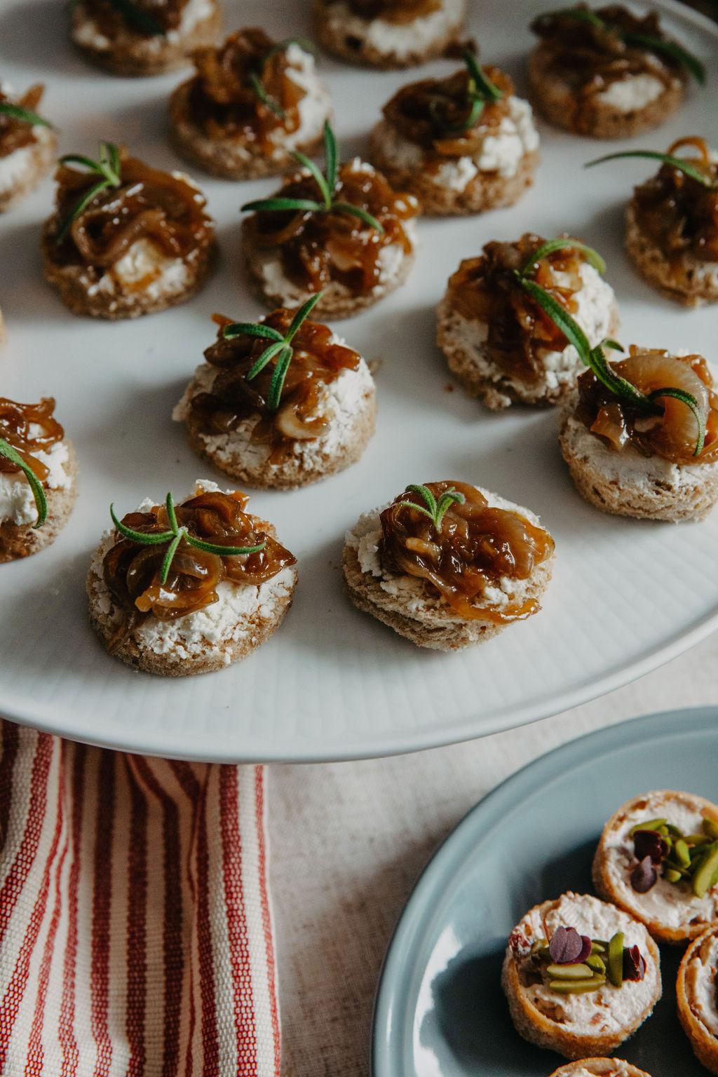 5. Toppa brödet med fetaost, karamelliserad lök och rosmarin.
