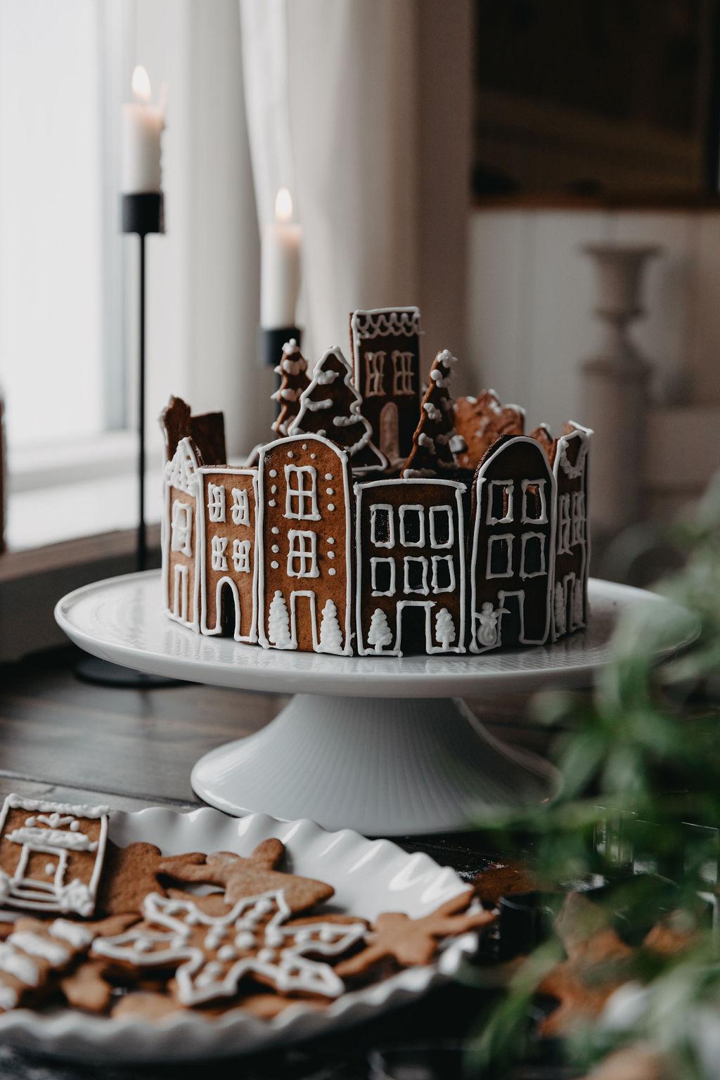 Pepparkakor:2 1/2 dl brunt farinsocker3/4 dl ljus sirap3/4 dl vatten150 g smör2–3 msk pepparkakskrydda (färdig i påse)6-8 dl vetemjöl1 1/2 tsk bikarbonatMjuk sockerkaka:4 dl vetemjöl0,5 tsk salt1 msk bakpulver3,5 dl strösocker2,5 dl mjölk1 dl olja3 äggKanel, saffran eller kardemummaGör så härPepparkakor:1. Blanda farinsockret, sirapen och vattnet i en kastrull. Koka upp blandningen.2. Lägg i smör och låt det smälta. Tillsätt kryddorna.3. Låt kallna utan omrörning.4. Rör i bikarbonaten och mjölet.5. Linda in degen i en bit plastfolie. Låt den stå kallt, helst till nästa dag.6. Plocka ut degen. Sätt ugnen på 225°C.7. Arbeta degen smidig på mjölat bord.8. Kavla ut degen tunt. Skär ut kakor i form av konturer av en stads skyline med en kniv. Skär ut detaljer som dörrar, fönster och skorstenar. Lägg dem på på bakplåtspapper. Grädda kakorna mitt i ugnen i 225°C, cirka 5 min.
