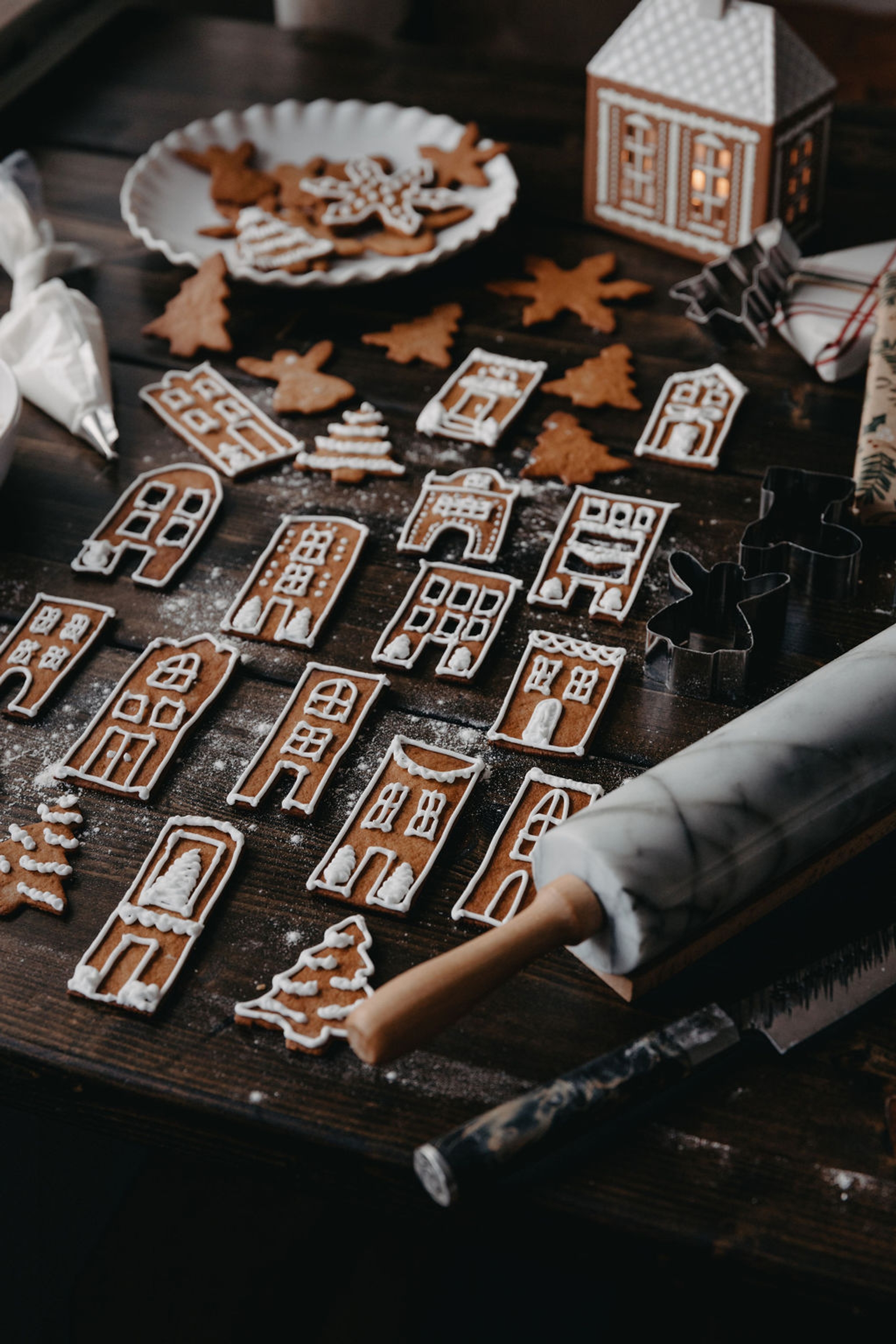 8. Kavla ut degen tunt. Skär ut kakor i form av konturer av en stads skyline med en kniv. Skär ut detaljer som dörrar, fönster och skorstenar. Lägg dem på på bakplåtspapper. Grädda kakorna mitt i ugnen i 225°C, cirka 5 min.