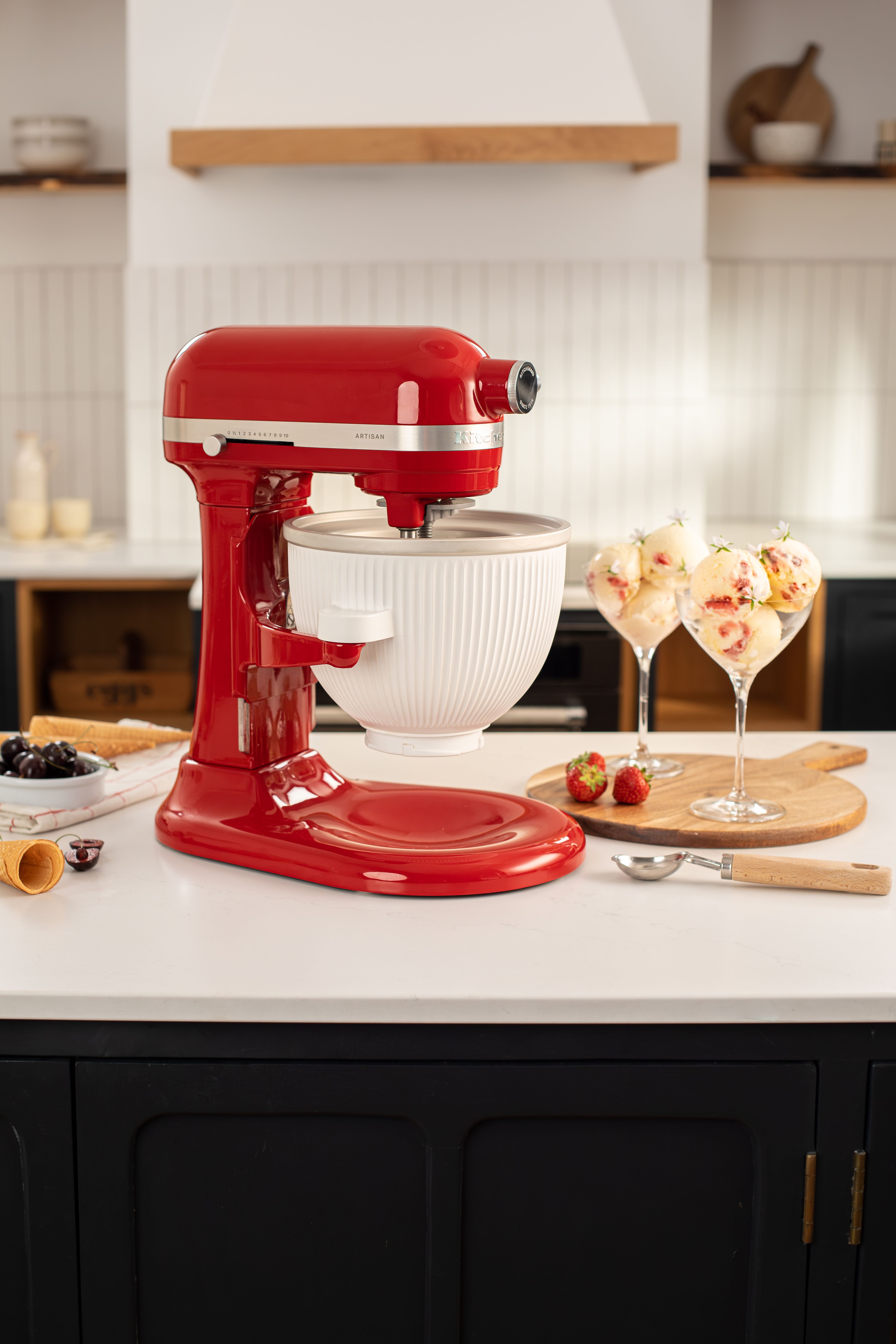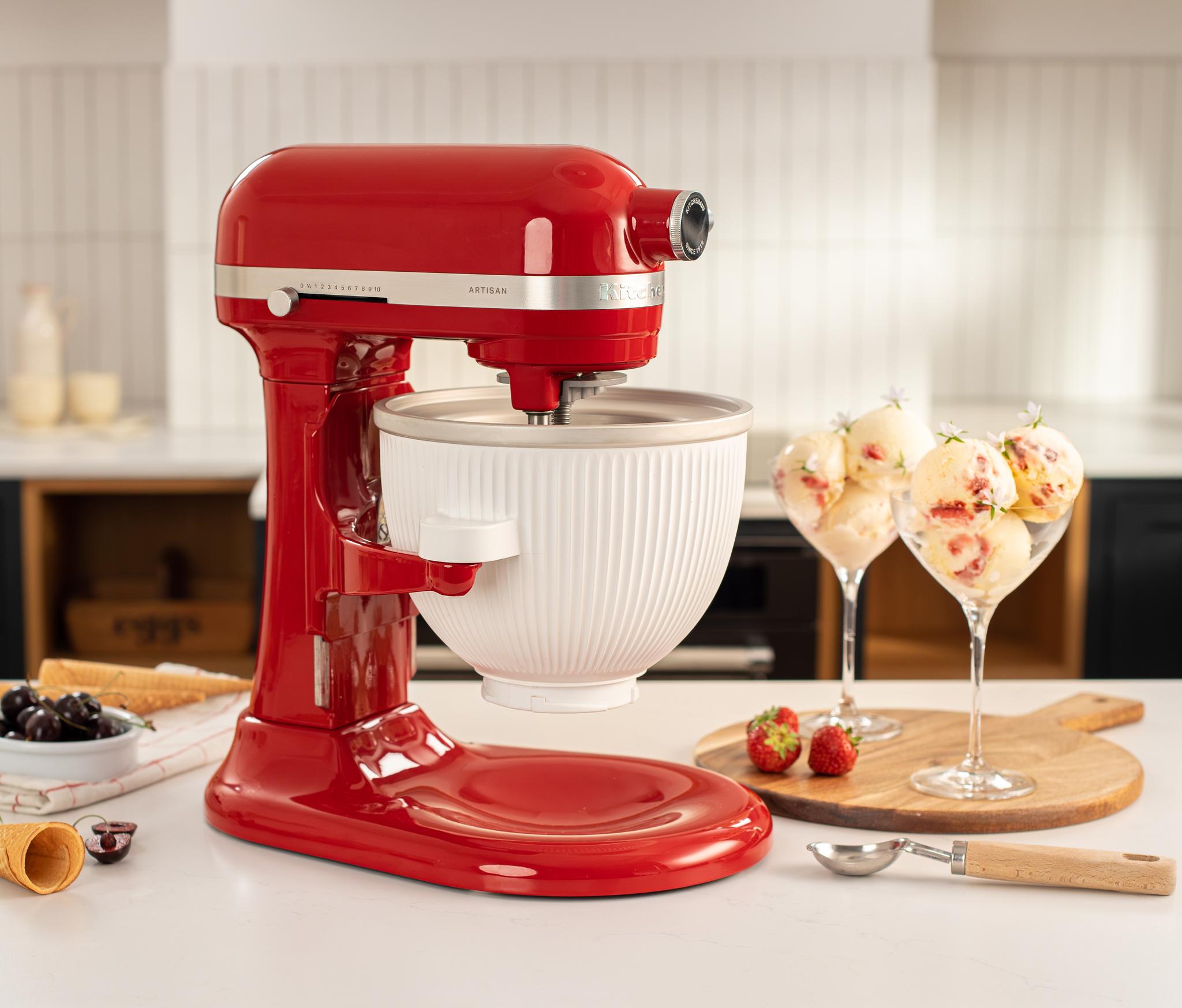 Med hjälp av glasstillbehöret förvandlar du din KitchenAid köksmaskin till en förstklassig glassmaskin. På mindre än 30 minuter har du en härligt len och jämn glass eller sorbet att imponera på dina middagsgäster med. Glasstillbehöret har både blandredskap och glasskål i en ny, förbättrad design. Skålens montering och dubbla handtag gör det ännu enklare att hantera och ansluta till din KitchenAid köksmaskin. Glasskålen har en kapacitet på 1,9 liter och blandredskapet roterar i skålen längs sidorna, vilket resulterar i en jämn frysning men även att att ingredienserna blandas ordentligt. För bästa resultat bör förfrysas glasskålen frysas i 16 timmar innan du använder den.