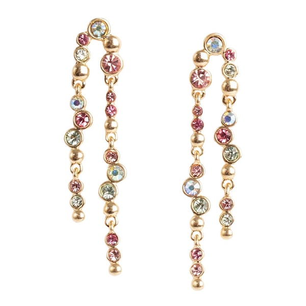 Sweet Droplets örhängen i två rader 50 mm guld/multi från A&C Oslo kombinerar guldpläterad mässing med kristaller i flera nyanser. Den långa silhuetten och den dubbla designen ger ett exklusivt och festklart intryck.