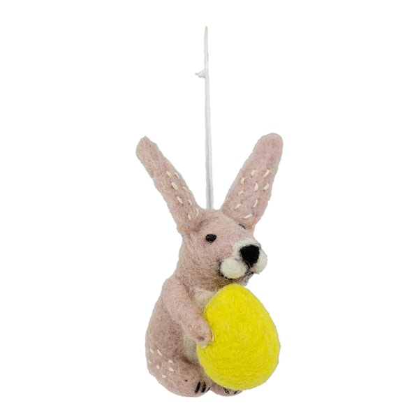 Bunny with Egg från A World of Craft är ett charmigt påskhänge i filtad ull. Den rosa kaninen som håller ett gult påskägg är handgjord i Nepals högland, vilket gör varje exemplar unikt. Med måtten 9x6 cm passar hänget perfekt i påskriset och skapar en lekfull och färgglad påskstämning.