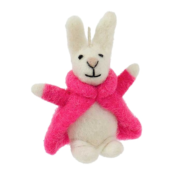 Bunny with Coat från A World of Craft är ett fint påskpynt i filtad ull, noggrant handgjort i Nepals högland. Påskhänget föreställer en vit kanin med en rosa jacka och mäter 9x6 cm. Låt detta påskpynt addera en lekfull och varm känsla till påskriset.