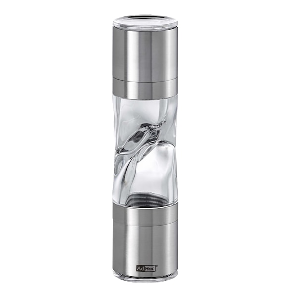 Duospice Mini Kryddkvarn 3,8x15 cm från AdHoc är den mindre modellen och är en stilren och elegant kryddkvarn i rostfritt stål och med en behållare i klar akryl. Den genomskinliga behållaren visar vad kvarnen innehåller så du kan fylla till exempel pepparkorn i den övre delen, och i den nedre delen torkad chili. Ena behållaren är avsedd för torkade kryddor och örter och den andra har en keramisk kvarn för peppar och salt. Kryddkvarnen har lock i båda ändarna för att undvika spill.