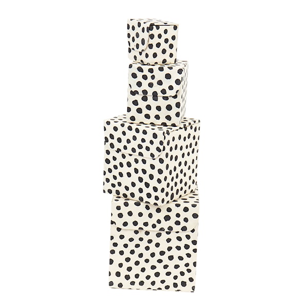 4 stycken handgjorda förvaringslådor i prickigt mönster från A World of Craft. De olika storlekarna gör det möjligt att organisera alla möjliga prylar och småsaker. Lådorna blir även fina inslag till inredningen var de än placeras. Magneten i locket gör att du enkelt kan öppna och stänga lådorna. Förvaringslådorna är tillverkad av papper gjort på busken Daphne Cannabina, som lokalt kallas lokta, i Nepal. Landet är känt för att tillverka papper för hand och har en lång tradition inom hantverket.