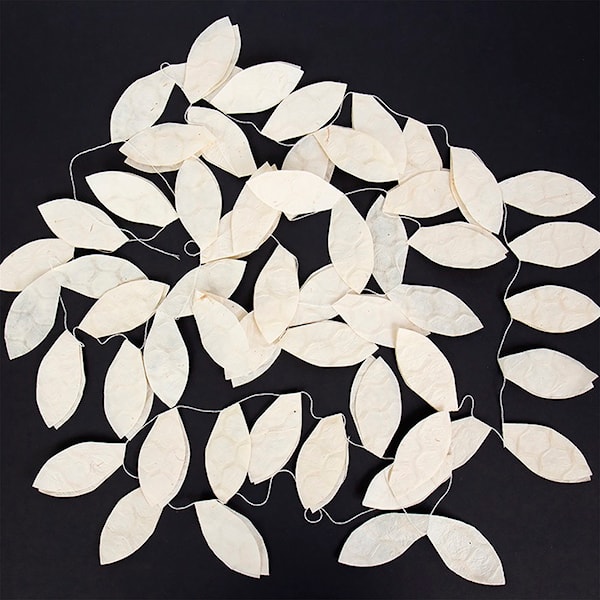 Vita skira löv ger en romantisk känsla som för in naturen i ditt hem. Funkar fint både vertikalt och horisontellt, vacker i fönstret och på bordet som en slingrig utsmyckning.