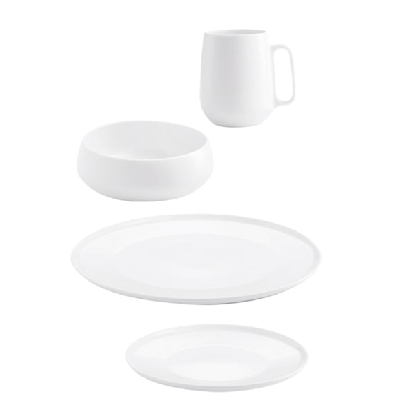 Detta set innehåller allt du behöver för en komplett dukning: 4 koppar, 4 assietter á 19 cm, 4 tallrikar á 26 cm, och 4 skålar. Varje del i servicen är utformad med en unik inåtformning som effektivt behåller både värme och aromer, vilket gör att dina rätter presenteras på bästa möjliga sätt. Tallrikarna har en extra stor matyta, perfekt för både vardag och festliga tillfällen, medan skålarna är idealiska för servering av soppor, sallader och andra rätter.