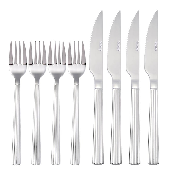 Groovy grillbestick från Aida är ett funktionellt och stilrent tillskott till matbordet. Setet består av åtta delar i stål, designade för att kombinera användarvänlighet med estetik. Det räfflade mönstret ger en diskret detalj till besticken, medan den blanka ytan i rostfritt stål skapar ett modernt och tidlöst uttryck.