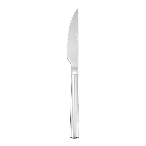 Groovy grillkniv på 22,8 cm från Aida är designad för att kombinera elegans med funktionalitet. Den räfflade eggen ger ett skarpt snitt genom biffar och andra kötträtter, medan det karakteristiska räfflade mönstret tillför en modern touch till besticket.