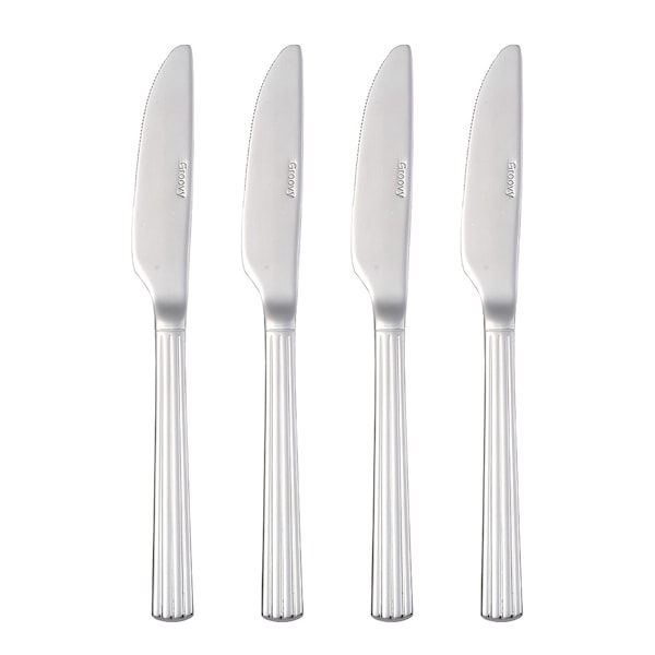 Fyra Groovy knivar i polerat rostfritt stål från Aida. Dessa knivar är en del av den stilfulla Groovy-serien, som kombinerar klassiskt formspråk med en distinkt, räfflad design. Med sitt moderna och tidlösa utseende är knivarna tillverkade av glänsande rostfritt stål, vilket ger dem både hållbarhet och en elegant finish. De är diskmaskinsvänliga, vilket gör dem enkla att sköta om och praktiska för vardagsbruk.