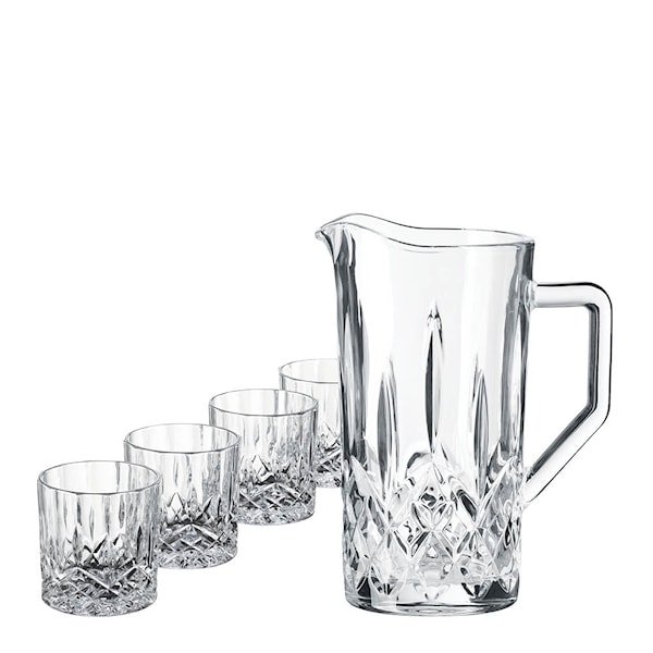 Detta Harvey-set kombinerar klassisk elegans med modern formgivning och blir en naturlig mittpunkt i varje dukning. Setet består av en stilfull kanna och fyra matchande glas, alla med den karaktäristiska fasetterade ytan som fångar ljuset och skapar ett sofistikerat uttryck. Den genomtänkta designen balanserar mellan tradition och nutid och gör att setet passar lika bra i hemmabaren som på vardagsbordet.