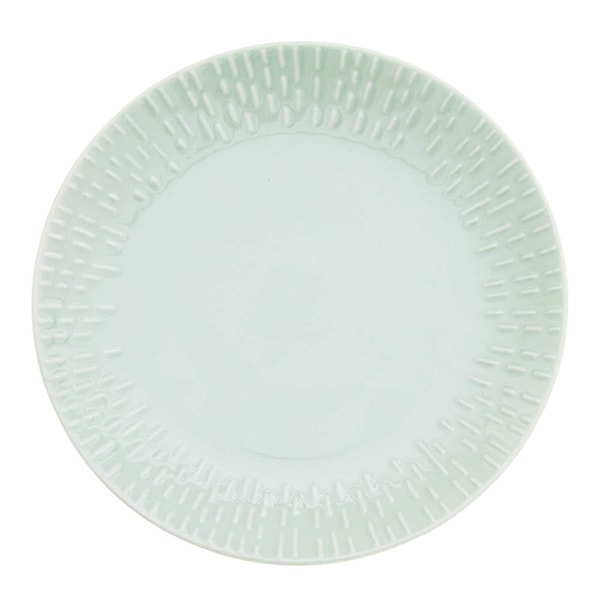 Tallriken är tillverkad i högkvalitativt, dubbelbränt porslin för extra tålighet i vardagen. Den är ugns-, mikrovågs- och fryssäker samt tål maskindisk. En lätt reliefdekor längs kanten ger en unik känsla till varje tallrik, och serien är framtagen för att passa i både färgglada och neutrala hem.
