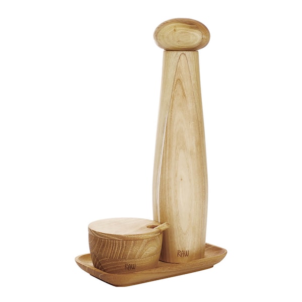 Aida RAW Teak keramisk pepparkvarn med bricka och saltkar är ett funktionellt och estetiskt val för köket. Setet består av en hög keramisk pepparkvarn, en stabil bricka och ett tillhörande saltkar, allt tillverkat av teak som ger en varm och naturlig finish.