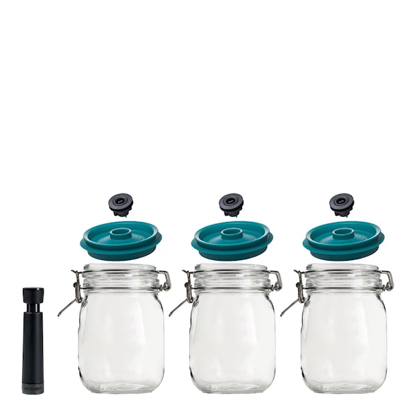 Airtender vakuumförslutarer-sett med 3-pack 1,5-liters weck-burk grön ger dig allt du behöver för att hålla livsmedel fräscha upp till fem gånger längre. Settet innehåller en vakuumpump, tre lock och stoppers, samt tre klassiska weck-burkar på 1 liter. Genom att skapa ett vakuum i burkarna minskar du syrehalten, vilket förhindrar oxidation och bevarar livsmedlets smak och kvalitet betydligt längre än med vanlig lufttät förvaring.