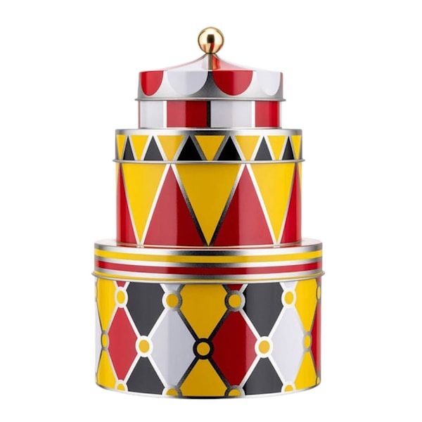 Alessi Circus plåtburkar 3-pack är ett dekorativt set med tydlig karaktär. Formgivna av Marcel Wanders pryds burkarna av ett detaljrikt cirkusmönster i livfulla färger, vilket gör dem till ett blickfång i köket eller på dessertbordet.