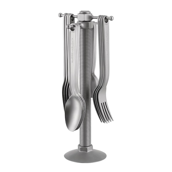 Conversational Objects bestickset, 16 delar med ställning från Alessi, är en perfekt kombination av stil och funktion. Designad av den visionära Virgil Abloh, erbjuder denna uppsättning en elegant lösning för ditt matbord. Tillverkad i rostfritt stål, är varje bestick en designklassiker, och den sofistikerade bestickställningen gör detta set både praktiskt och visuellt slående.