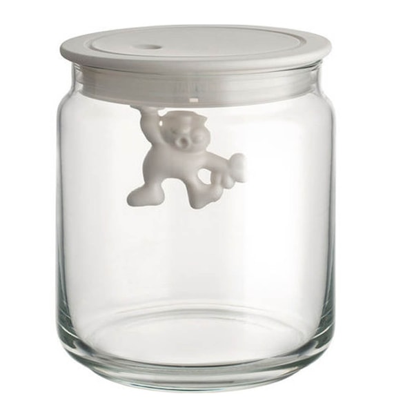 Gianni glasburk 0,7 L från Alessi är en stilren förvaringslösning med en humoristisk detalj. Designad av CSA och Mattia Di Rosa kännetecknas den av den lilla figuren som hänger under locket och ger burken ett lekfullt blickfång.