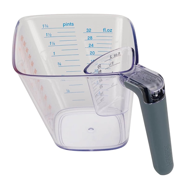 Denna praktiska mätkopp har en tydlig design där måtten kan läsas uppifrån, vilket förenklar mätningen. Handtaget är utrustat med en liten minikanna för att smidigt mäta mindre mängder. Joseph Joseph, grundat 2003 av tvillingarna Richard och Antony Joseph, specialiserar sig på moderna köksredskap för att göra köksuppgifter enklare. De är kända världen över för sina tekniskt innovativa produkter med en intelligent design och har utsetts till ett av de främsta varumärkena inom köksutrustning.